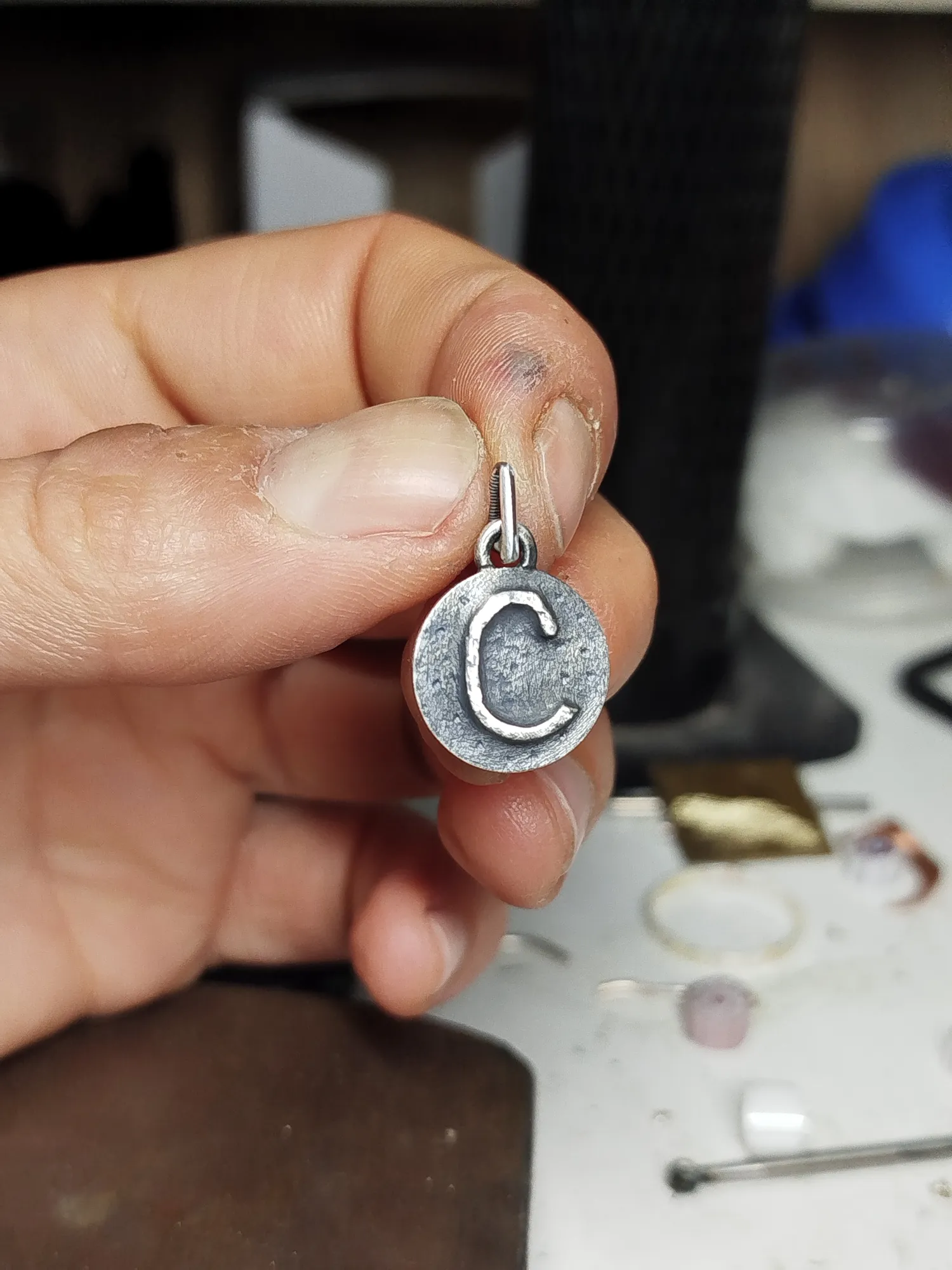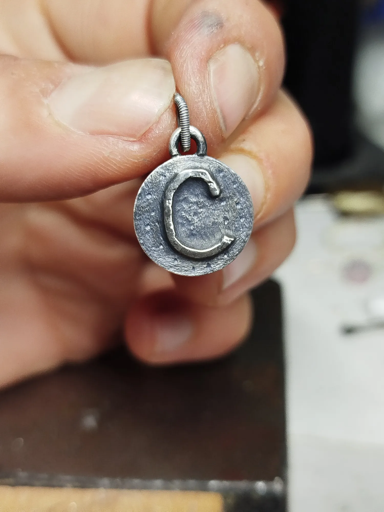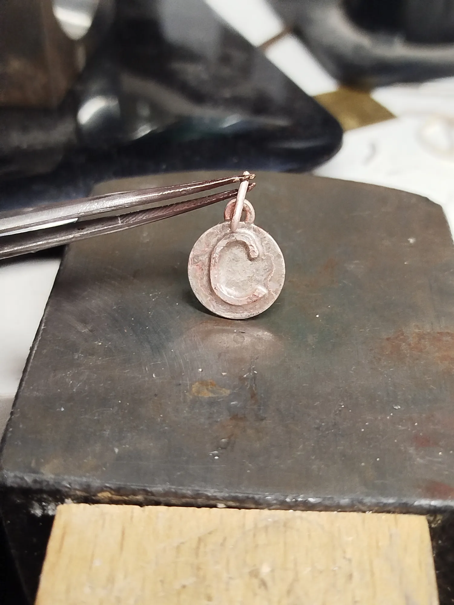 Чтоб вас очень не утомлять, после этого было: шкуркой 220 на диске грубо обработала петлю, шкуркой на 400 цилиндром края кулона. Дальше все на 600, потом на резинке лепестковой прошла. Немного абразивного волокна, немного розовой резинки, дальше с двух сторон матовка бором самодельным. Молоточком так пару раз. Шучу, три раза.