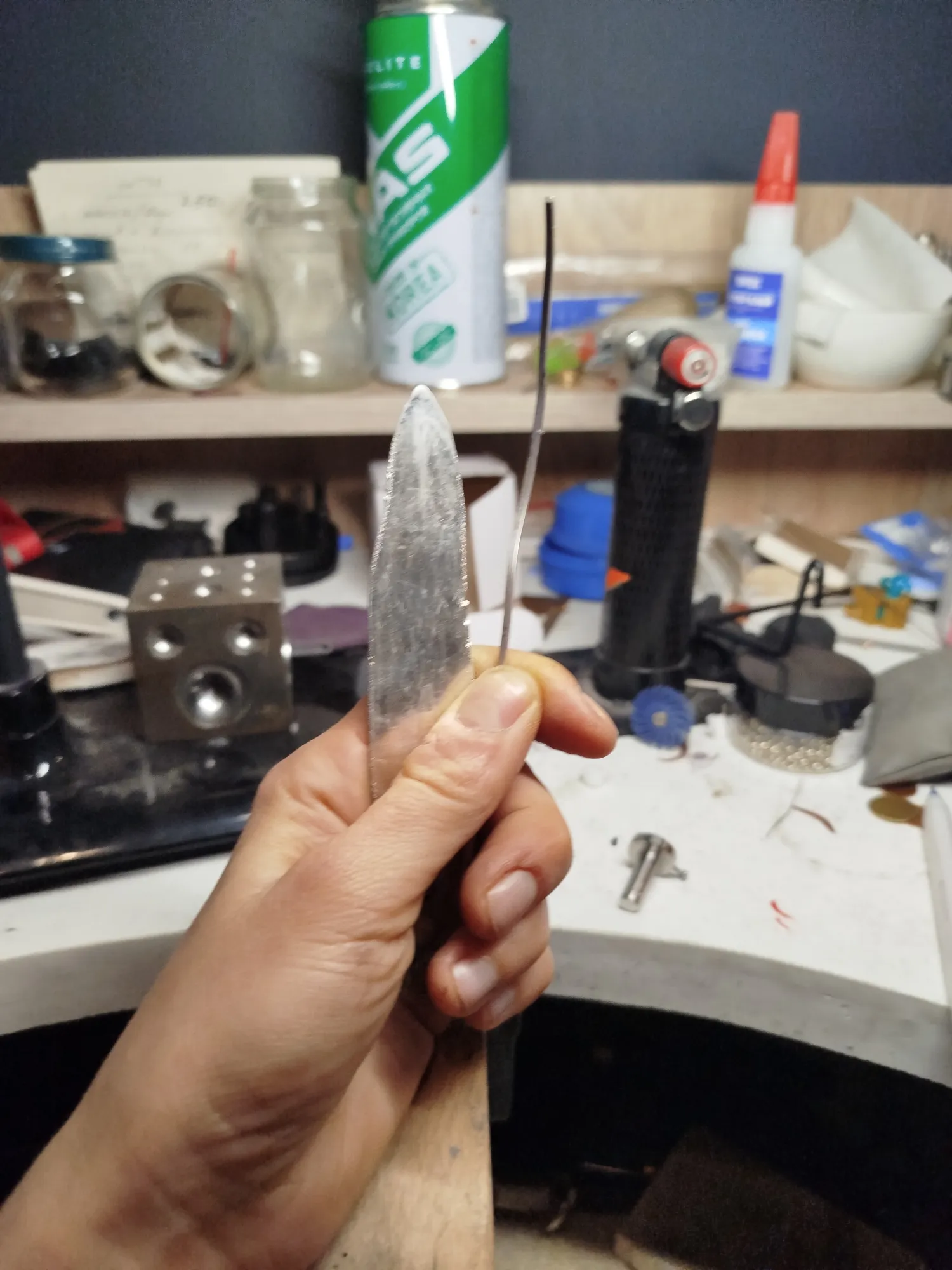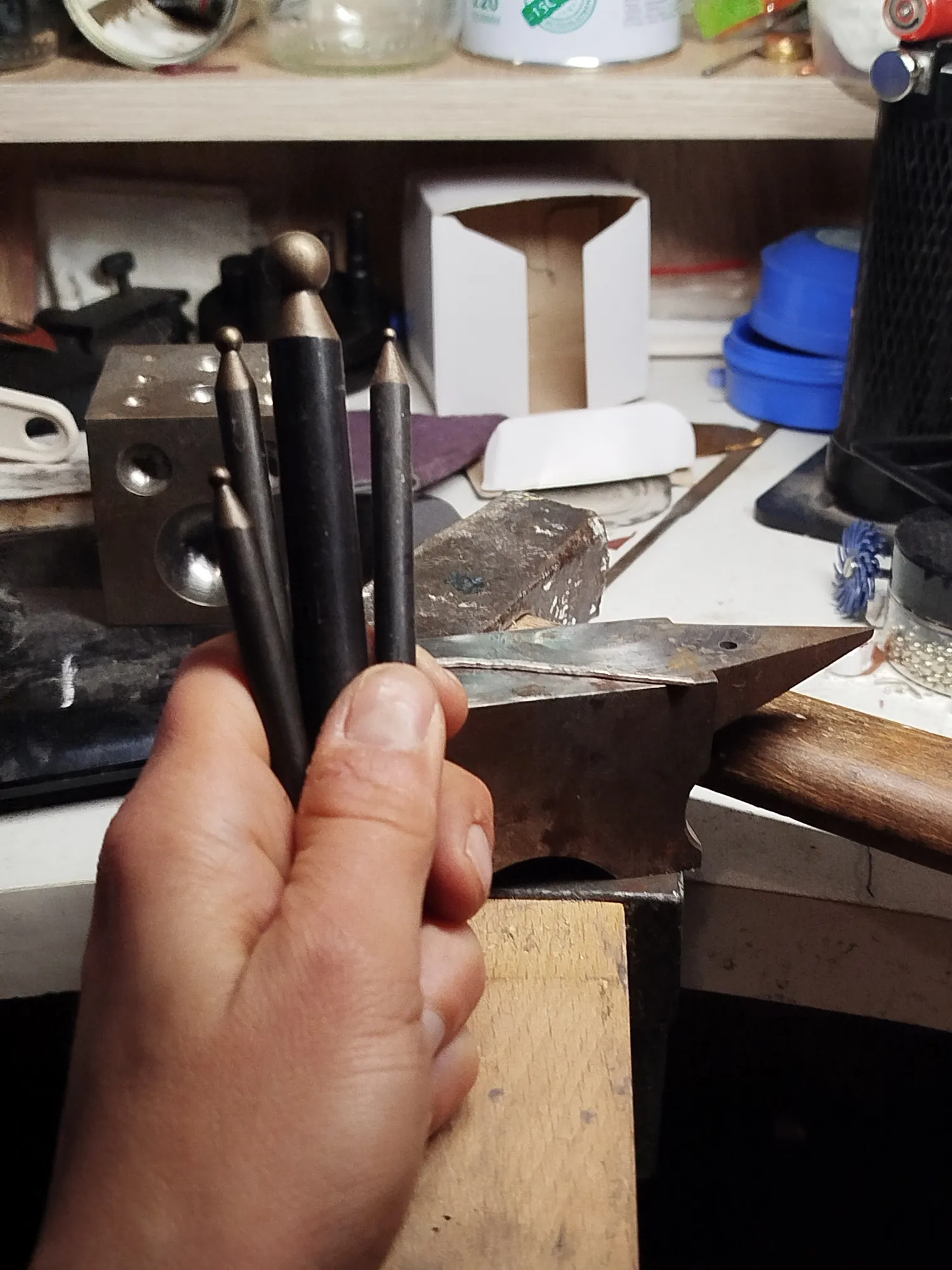 Из листа металла вырезаю круг, запиливаю края. Беру проволоку и сильно думаю как имитировать ковку-ведь в рассказе его ковали. Беру пунзелы разного диаметра и прижимаю ими проволоку к наковальне. Стучу молоком два раза (и третий тоже, но послабже)