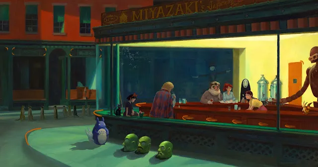 Вообще «Полуночники» неоднократно становилась и объектом пародий и различных переработок (вроде бы даже была отсылка в «Симпсонах», в кино на эту картину множество отсылок – на пикабу читал статью давно). Больше всего мне нравятся одна из таких переработок.