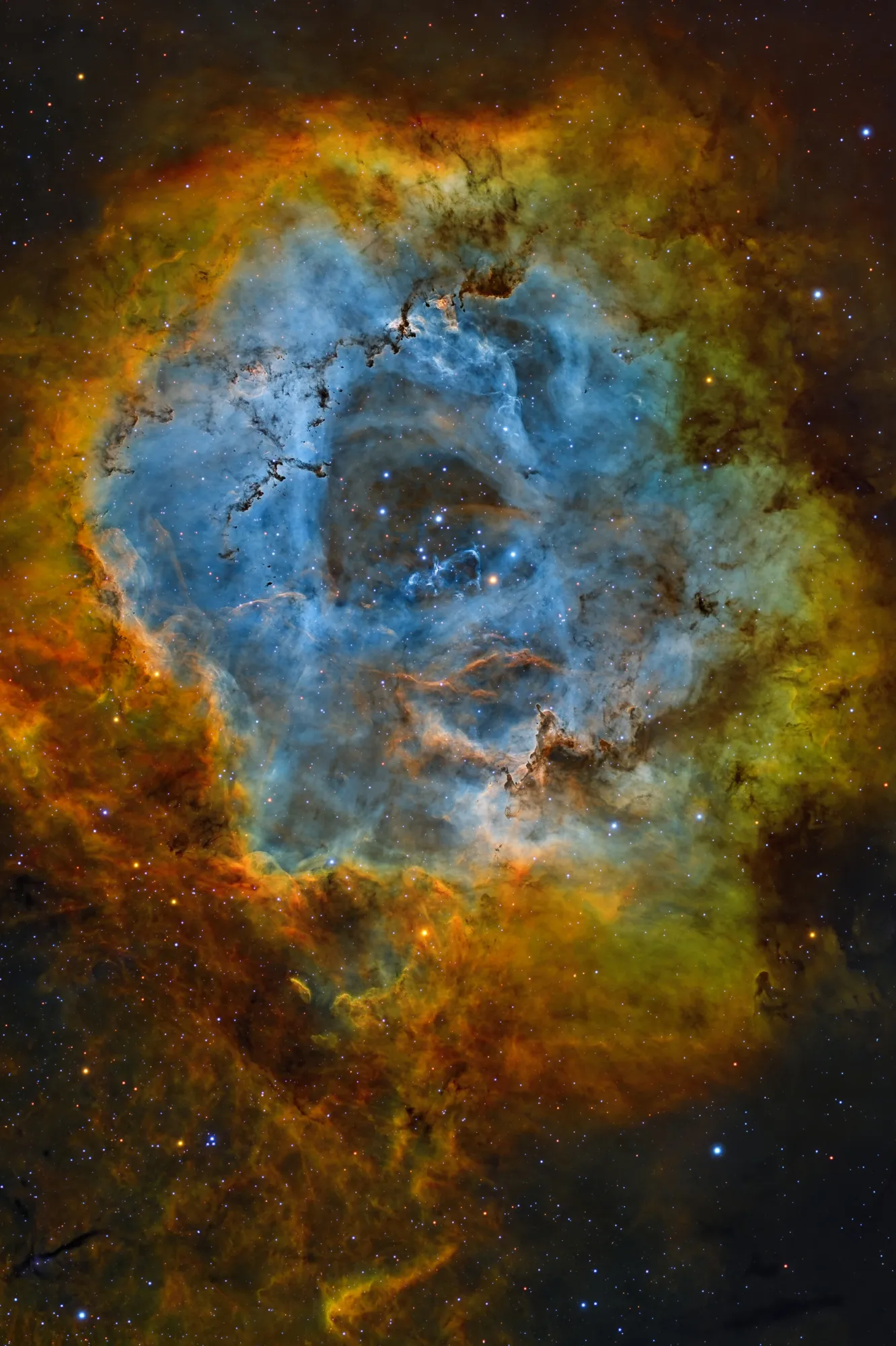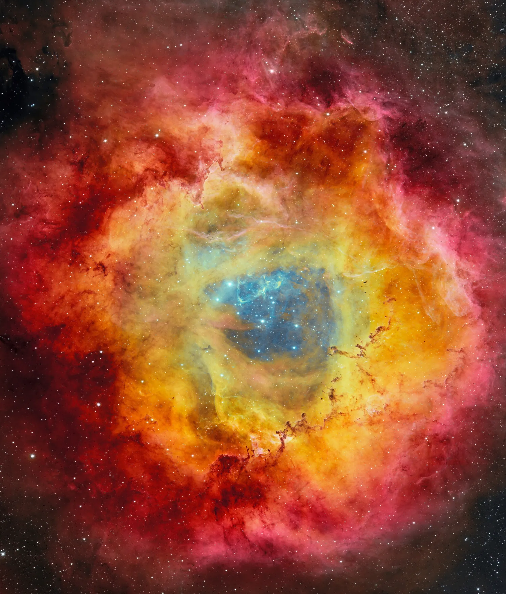 Небесная роза уже приносит плоды, ведь это еще одна звездная колыбель – огромное молекулярное облако, в котором формируются новые звезды. В центре совсем недавно родились несколько звезд и очистили его звездным ветром. Диаметр получившейся полости – около 50 световых лет.