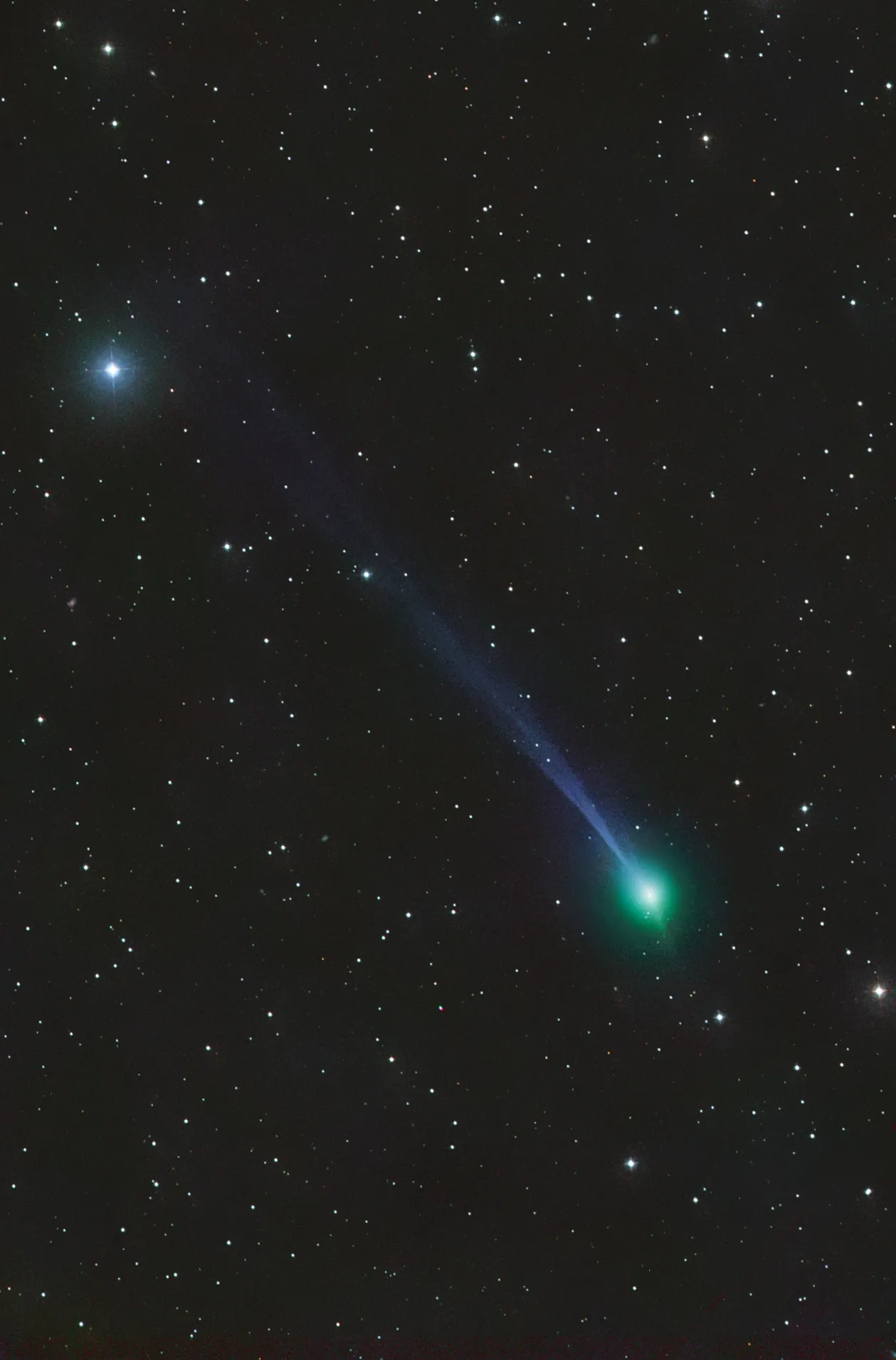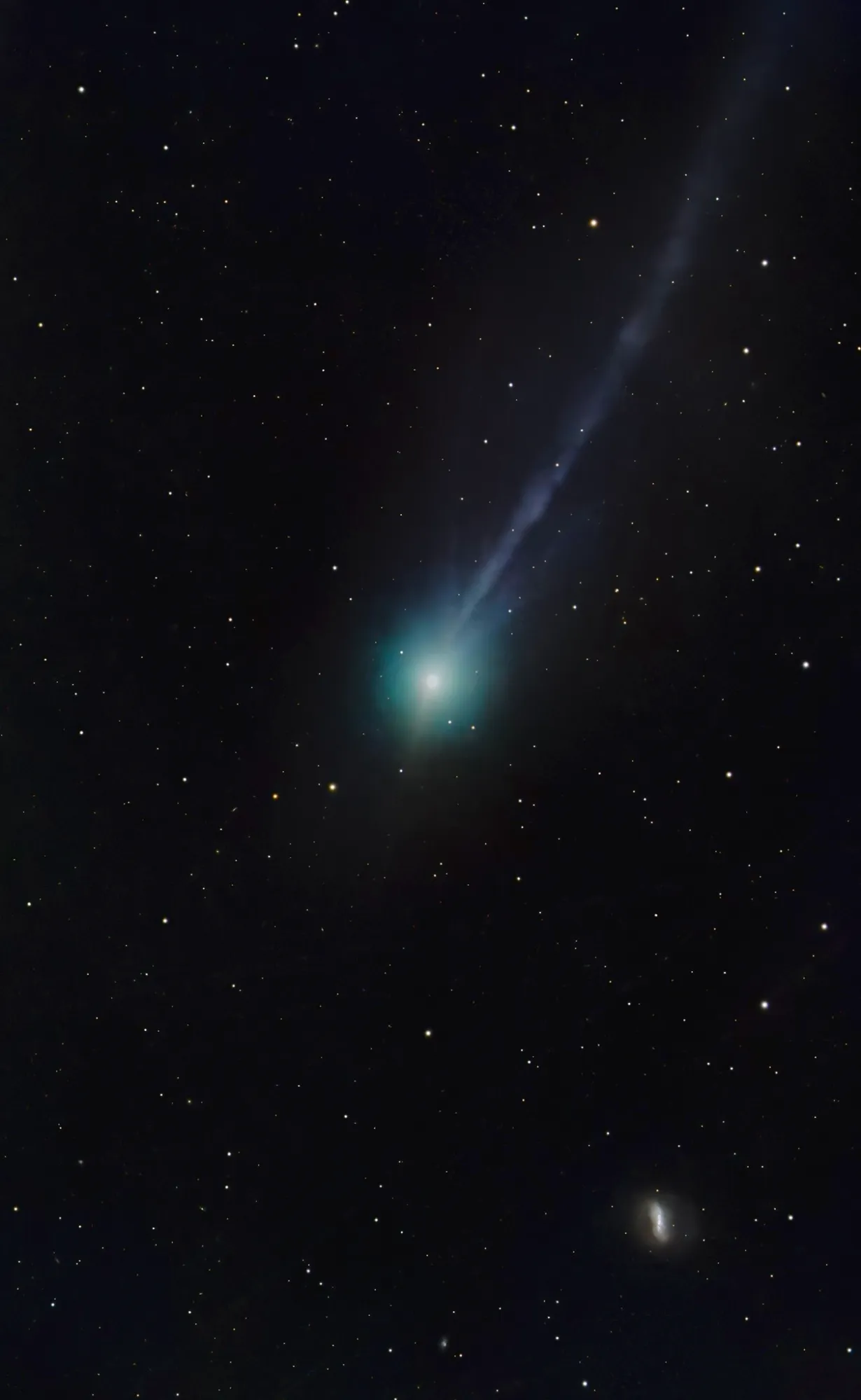 Сверху видна спиральная галактика NGC 2936 ("Пингвин"), которая сильно деформирована из-за гравитационного взаимодействия с эллиптической галактикой NGC 2937 ("Яйцо", видна ниже). Выше пары видна с ребра другая, более близкая к нам галактика.