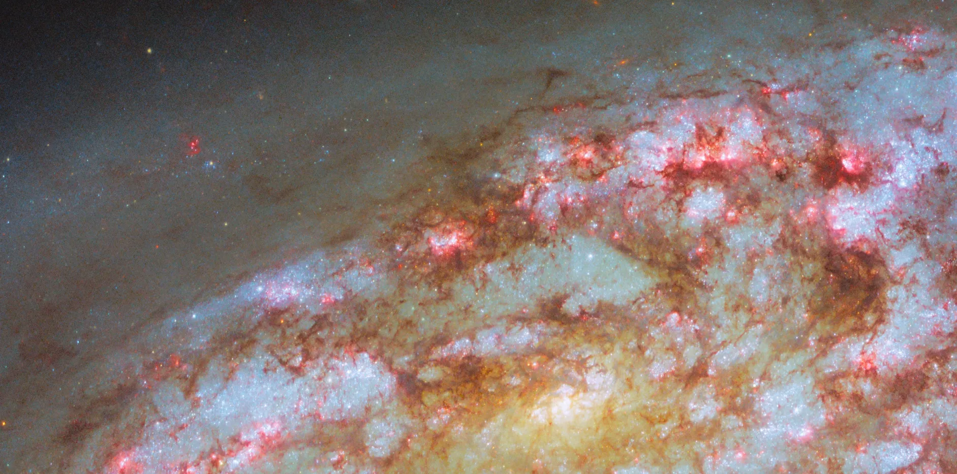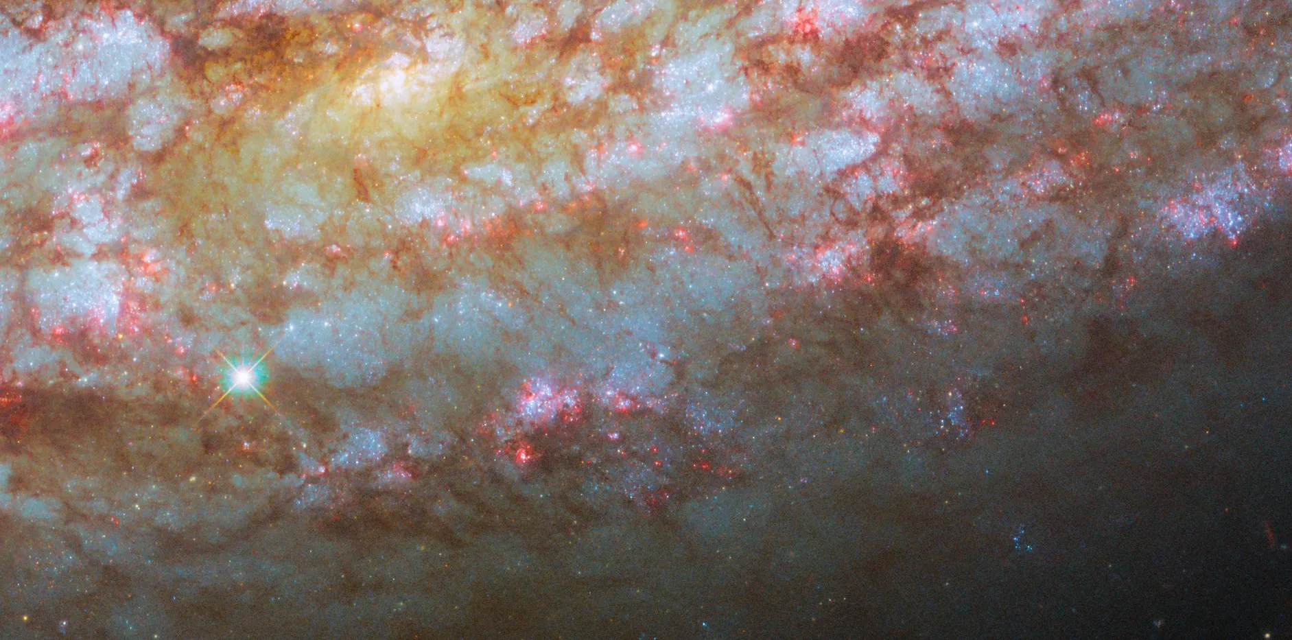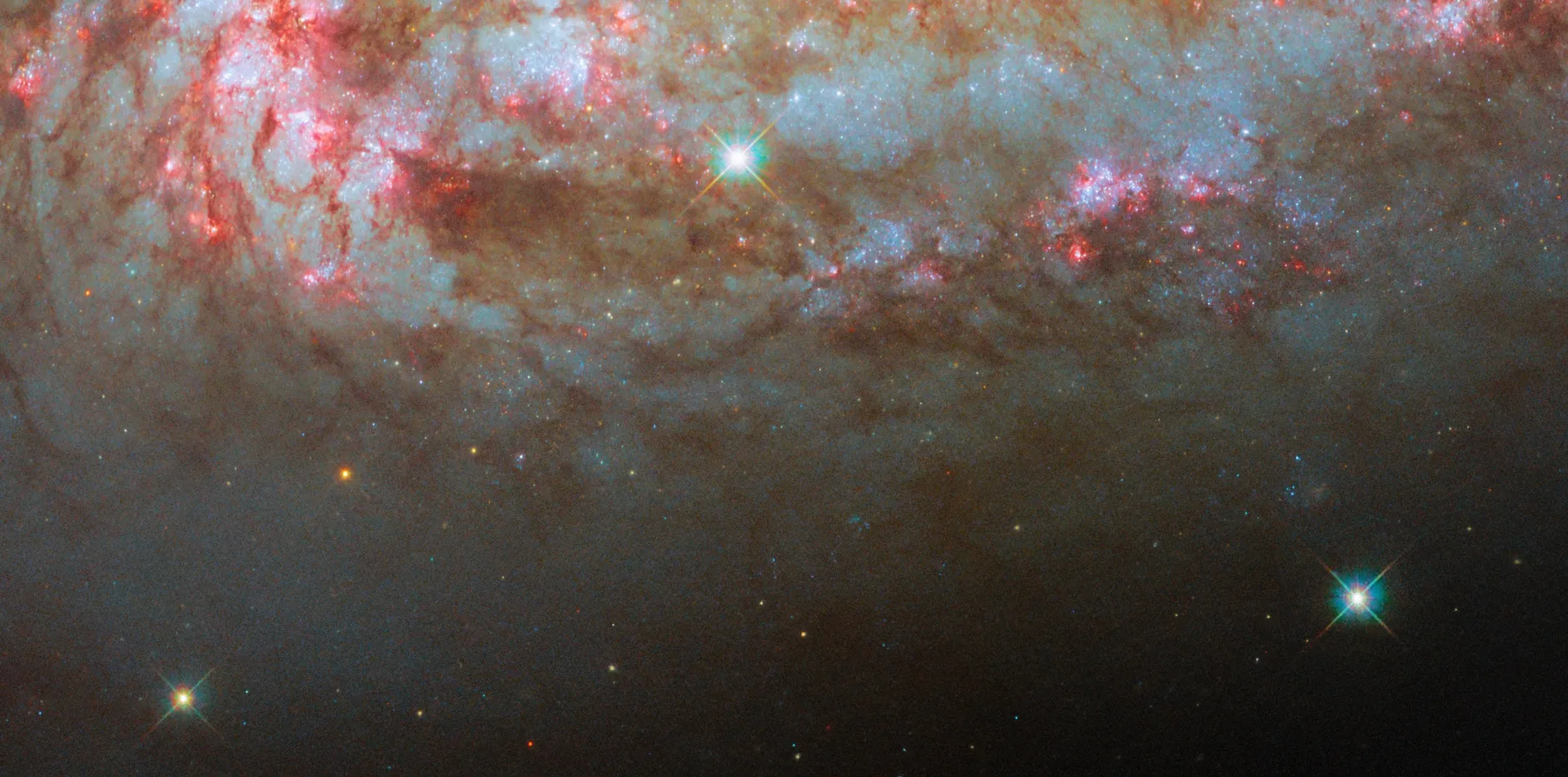 Сразу бросаются в глаза её клочковатые спиральные рукава. Это объясняется тем, что галактика сейчас переживает вспышку звёздообразования. В такие моменты (обычно непродолжительные) звёзды могут рождаться раз в 10 интенсивнее, чем в Млечном пути. А значит и сверхновые там происходят гораздо чаще. Ух, не хотел бы я оказаться сейчас на месте обитателей NGC 1792.