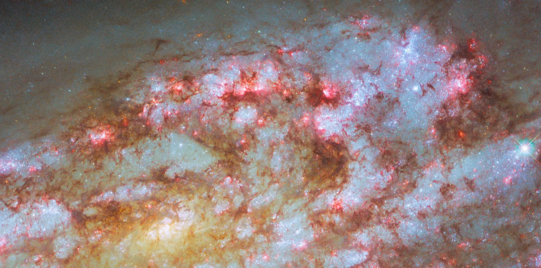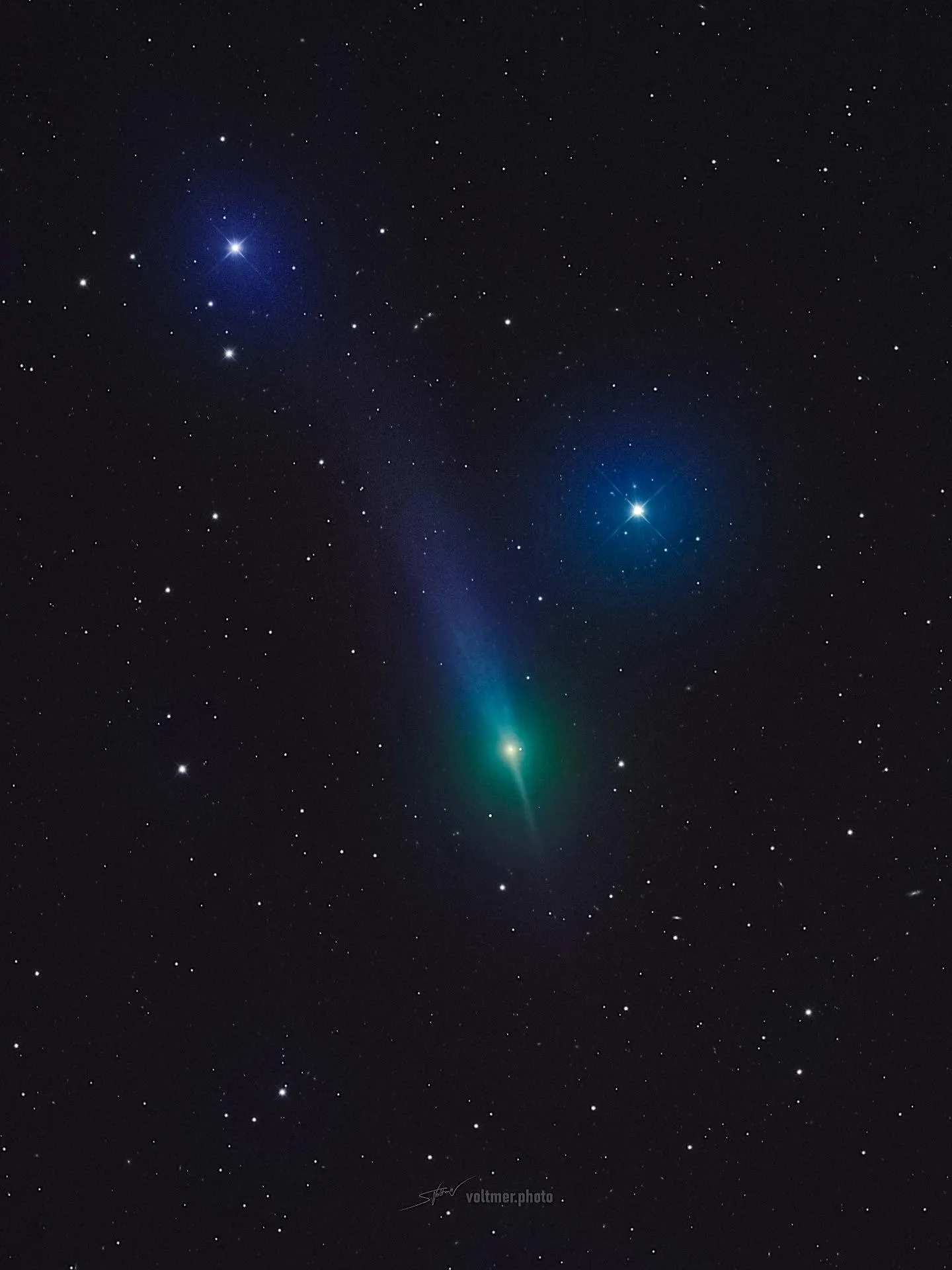 Примерно 200 млн лет назад эти две галактики подошли вплотную друг к другу. Большая NGC 4490 вытянула из соседки поток газа, образовав мост между ними, а затем примерно 30 млн лет назад произошел новый импульс звездообразования. Эти вспышки рождения звезд мы видим как ярко-синие участки ионизованного газа.