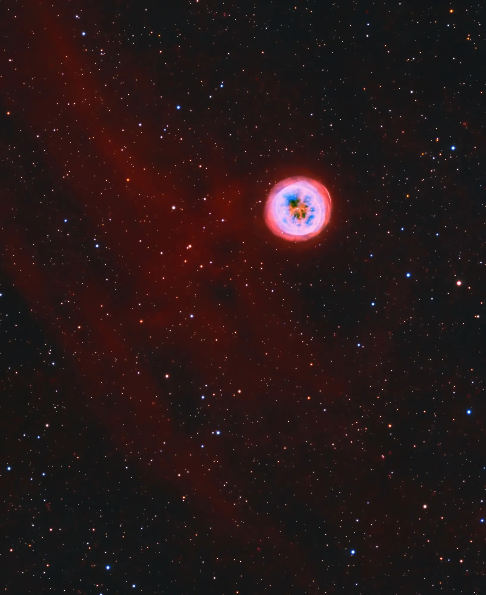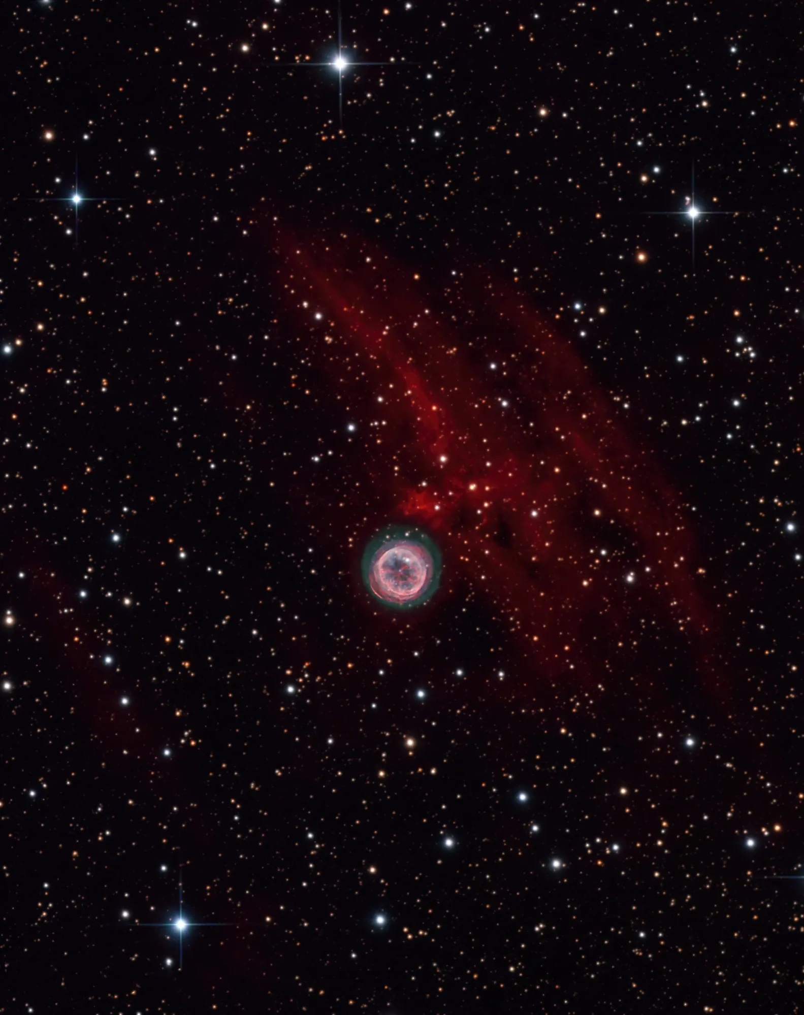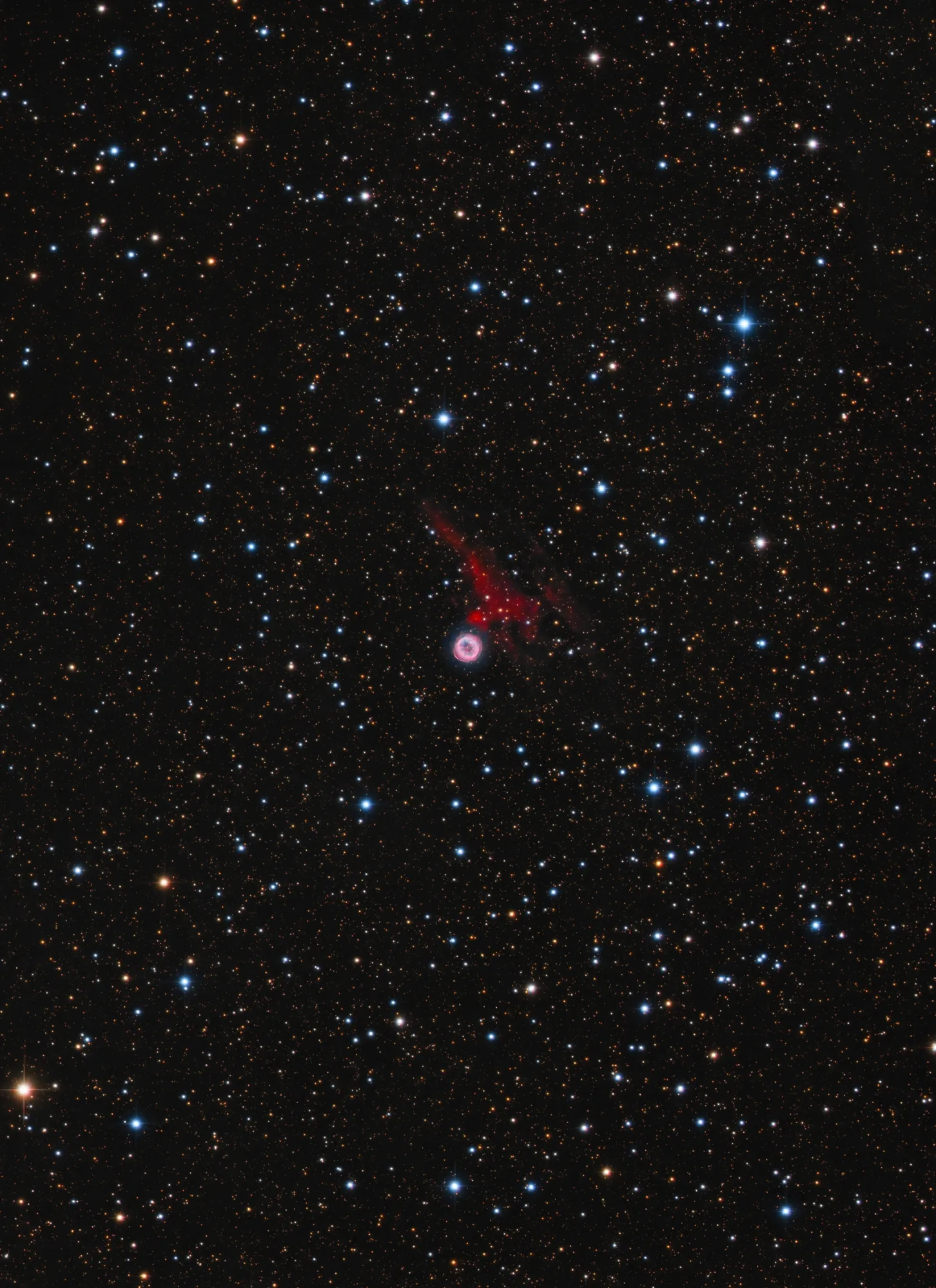 Этот снимок получен наземным телескопом «Gemini South», на нем показана планетарная туманность IC 5148 или «Запасное колесо», расположенная на расстоянии около трех тысяч световых лет от Солнца в созвездии Журавля. Это одна из самых быстро расширяющихся планетарных туманностей — скорость расширения оценивается в 180 тысяч километров в час. В центре IC 5148 находится белый карлик, окруженный ассиметричными газовыми оболочками, сброшенными умирающей звездой, а центральная полость возникает из-за потока излучения от белого карлика.