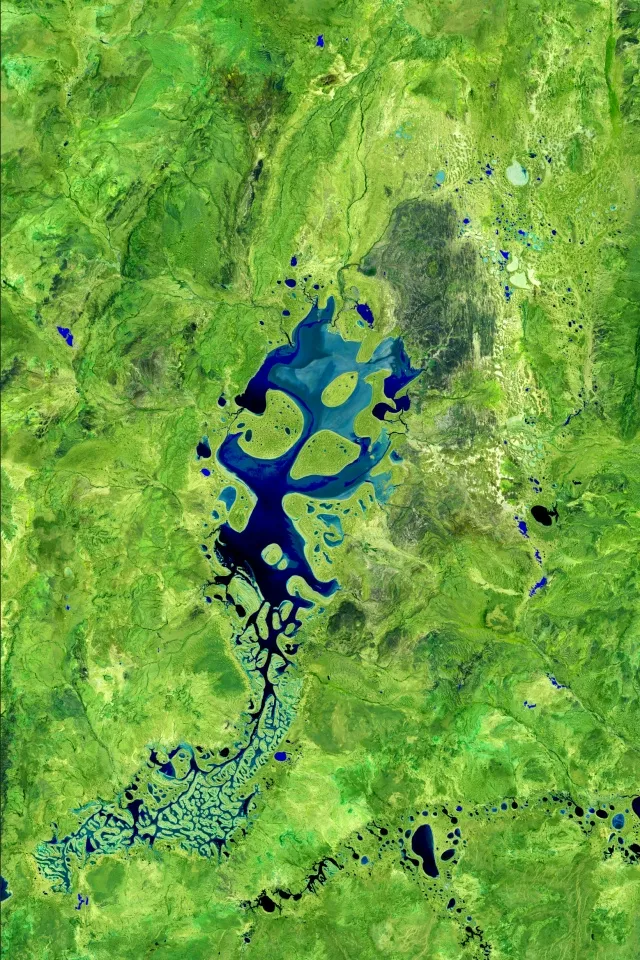 На первом изображении озеро показано в естественных цветах, на втором - ложных. Комбинация трех спектральных каналов выделяет воду насыщенным синим цветом, что позволяет определить характер затопления в этом районе.