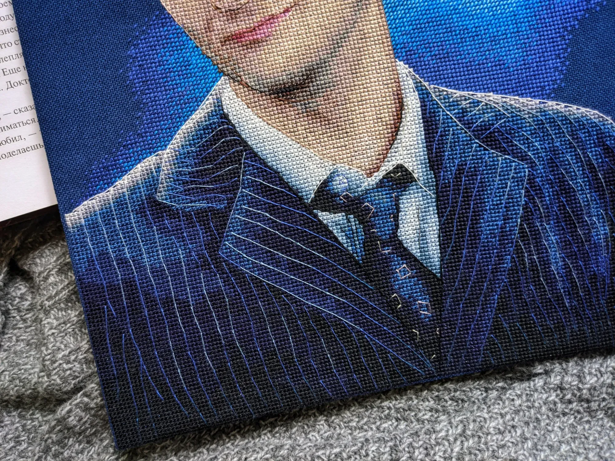Как только закончился этот нескончаемый тёмный пиджак, наконец стал появляться сам Десятый. Вместе с ним начала оживать и я. Процесс полетел, появился азарт: шея, подбородок, щёки, уши, нос, глаза... Черты собирались одна за другой, я ещё никогда так быстро не вышивала. Дальше фон и бэкстич – ничего сложного.