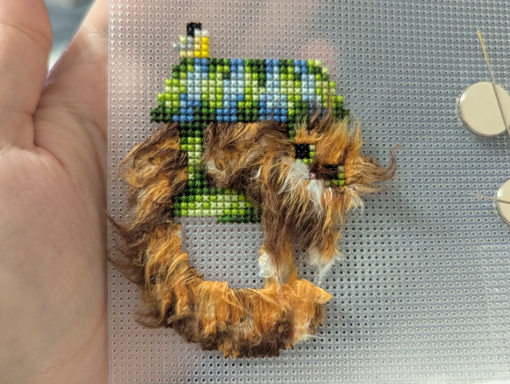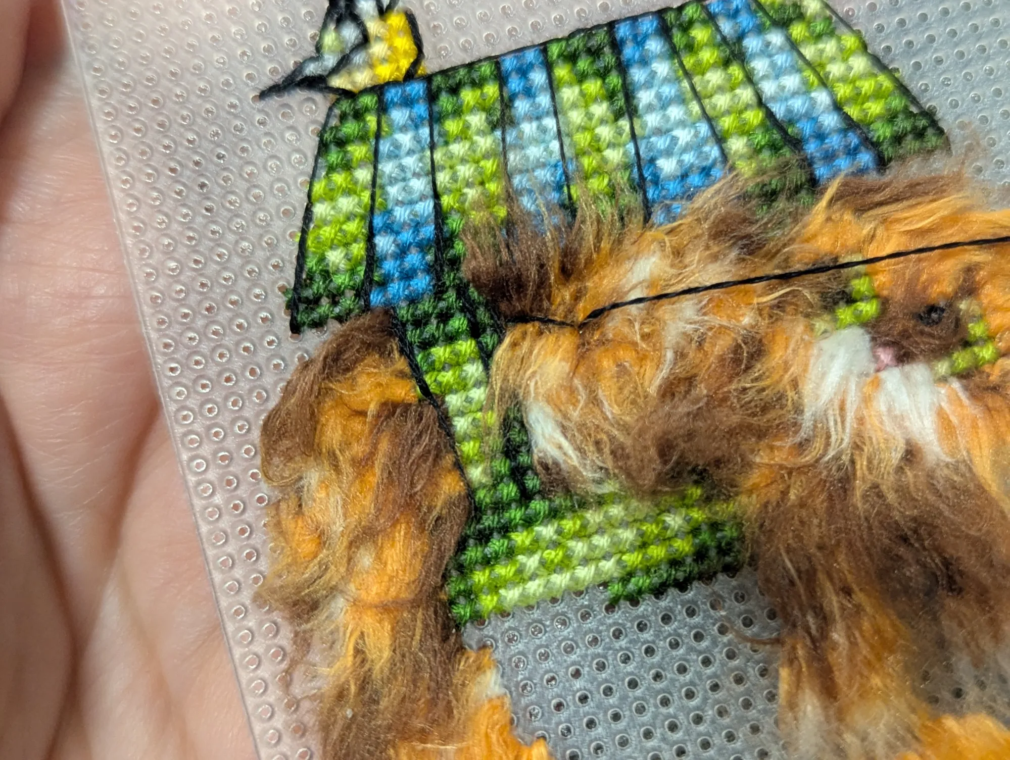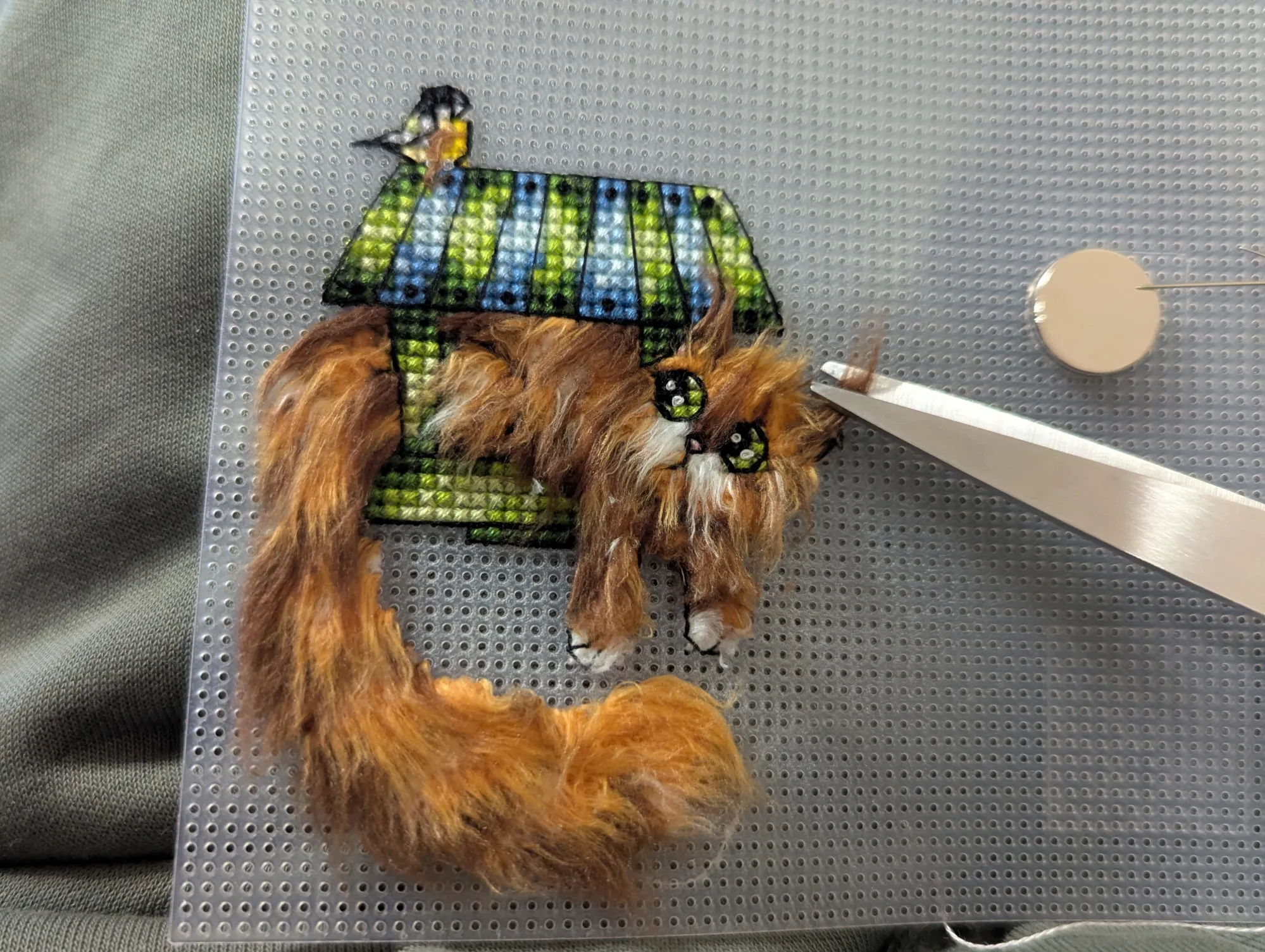 И теперь как следует начёсываю вышитое. Долго и упорно, пока нитки не распушатся в полноценный мех. Бояться нечего: если на изнанке всё закреплено правильно, крестики выдержат этот этап без проблем.