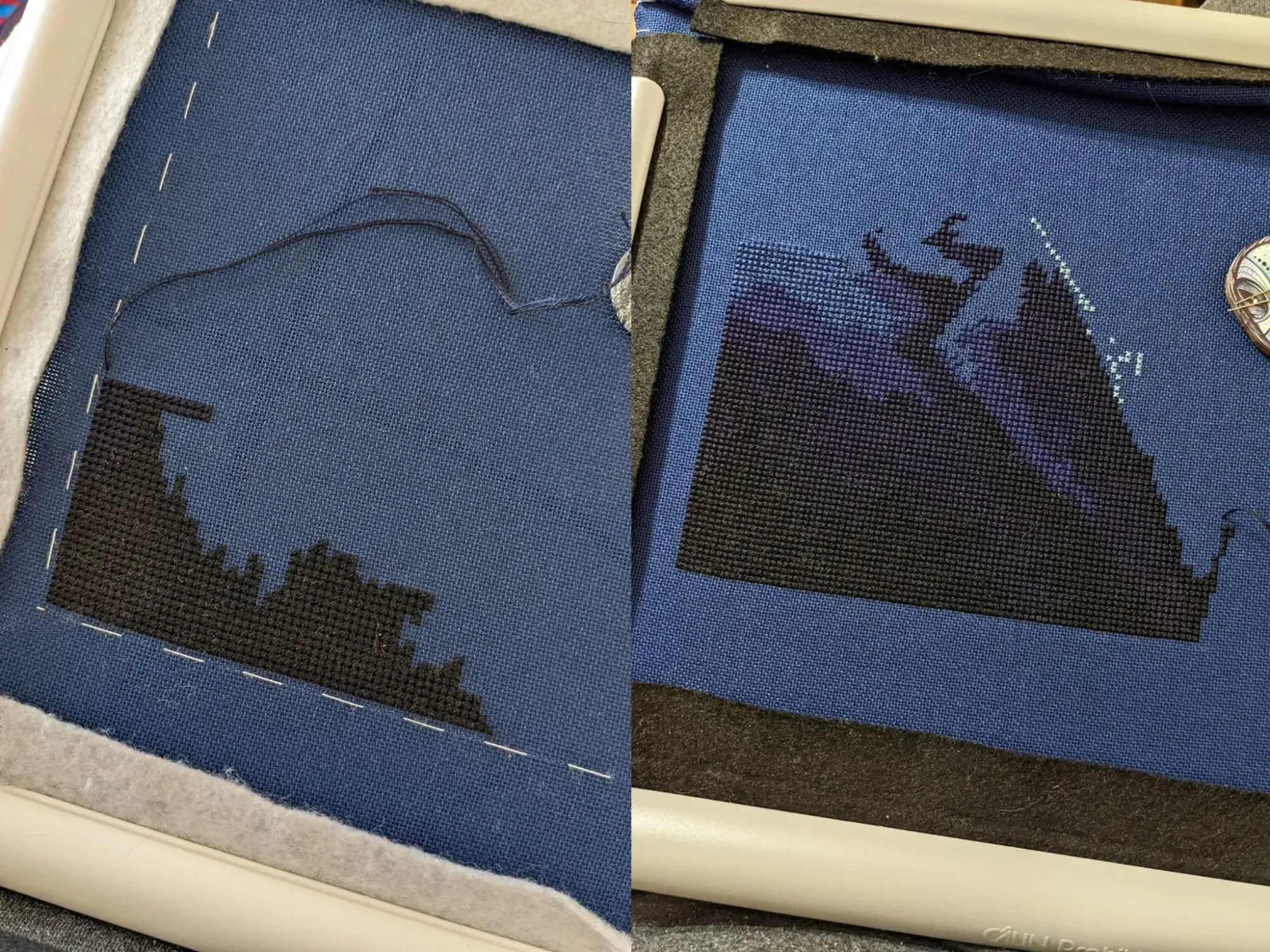 Дальше идёт уже самое интересное – постепенное заполнение неба. И нет, это не гладь, хоть и может так показаться. Стежки не спонтанны, а идут чётко по схеме (ну, или почти чётко, здесь было право на ошибку).