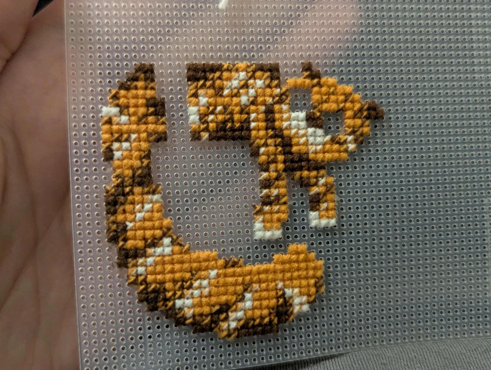 Как можно заметить, лиса получается не такой пушистой, как «птичка» из другого поста. Всё потому что теперь в каждом крестике только одна пушащаяся нить вместо двух, так как вторая – хлопковая.