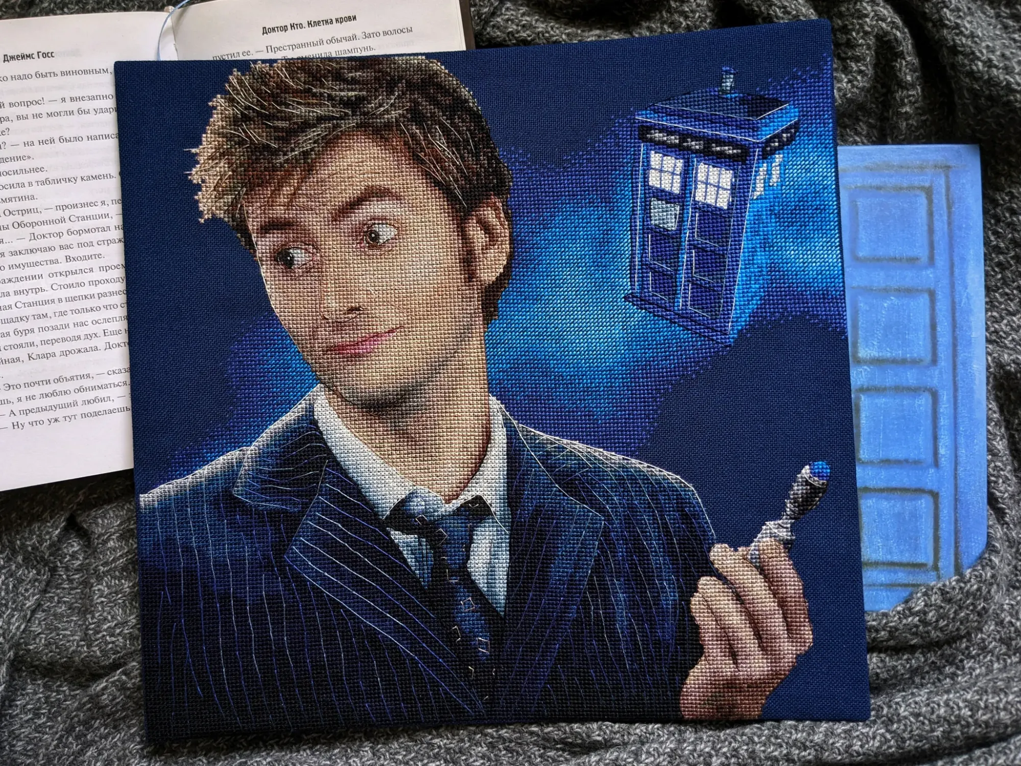 В январе того года в продаже появилась схема «Десятый Доктор». Моё любимое воплощение, любимый актёр – долго я не думала. Сразу же купила все необходимые материалы и с энтузиазмом приступила к вышивке. Но, к сожалению, очень быстро устала от «штопки» огромных участков одним цветом и отложила этот процесс в долгий ящик. Ждать ему пришлось целых два года.