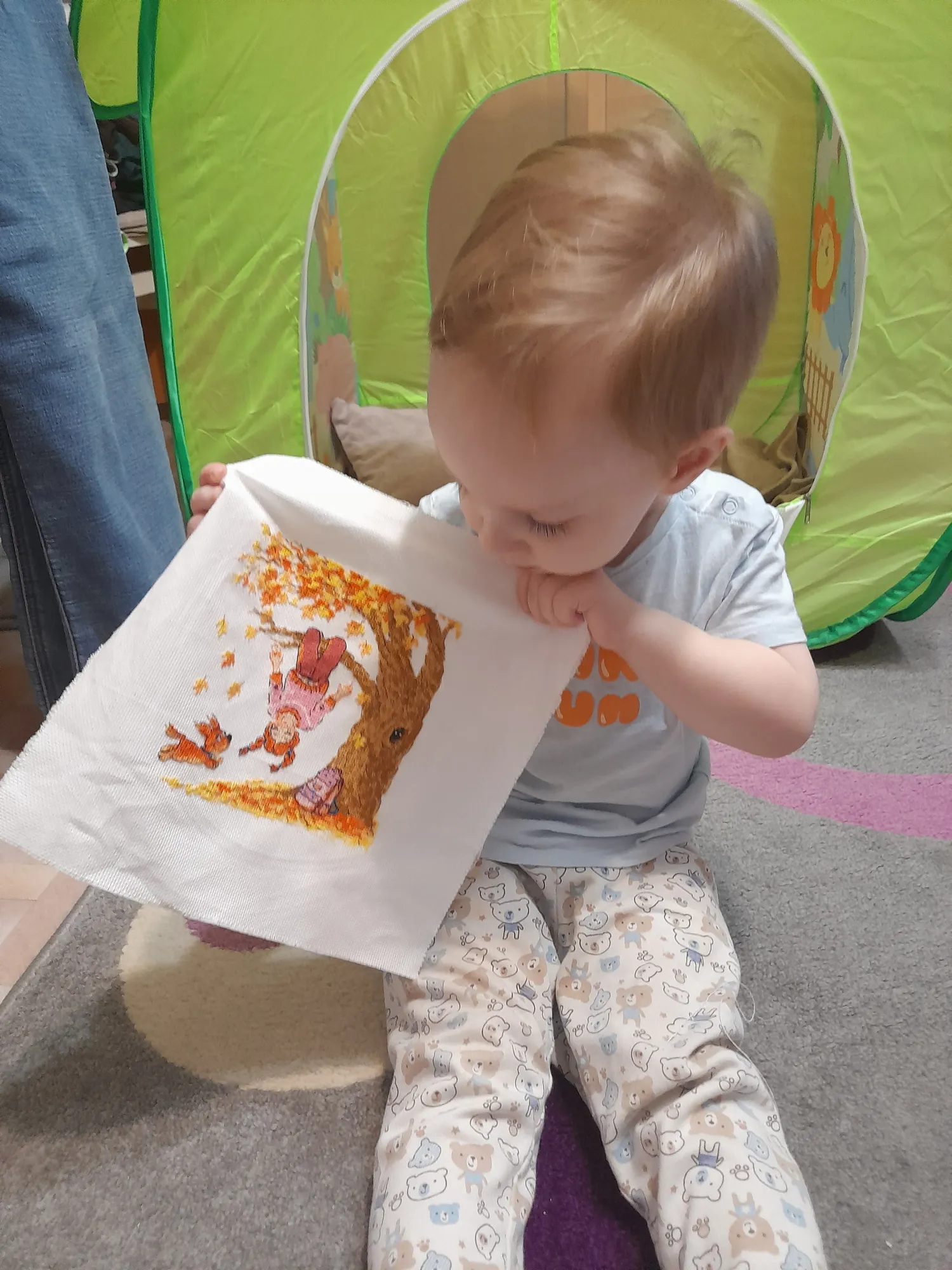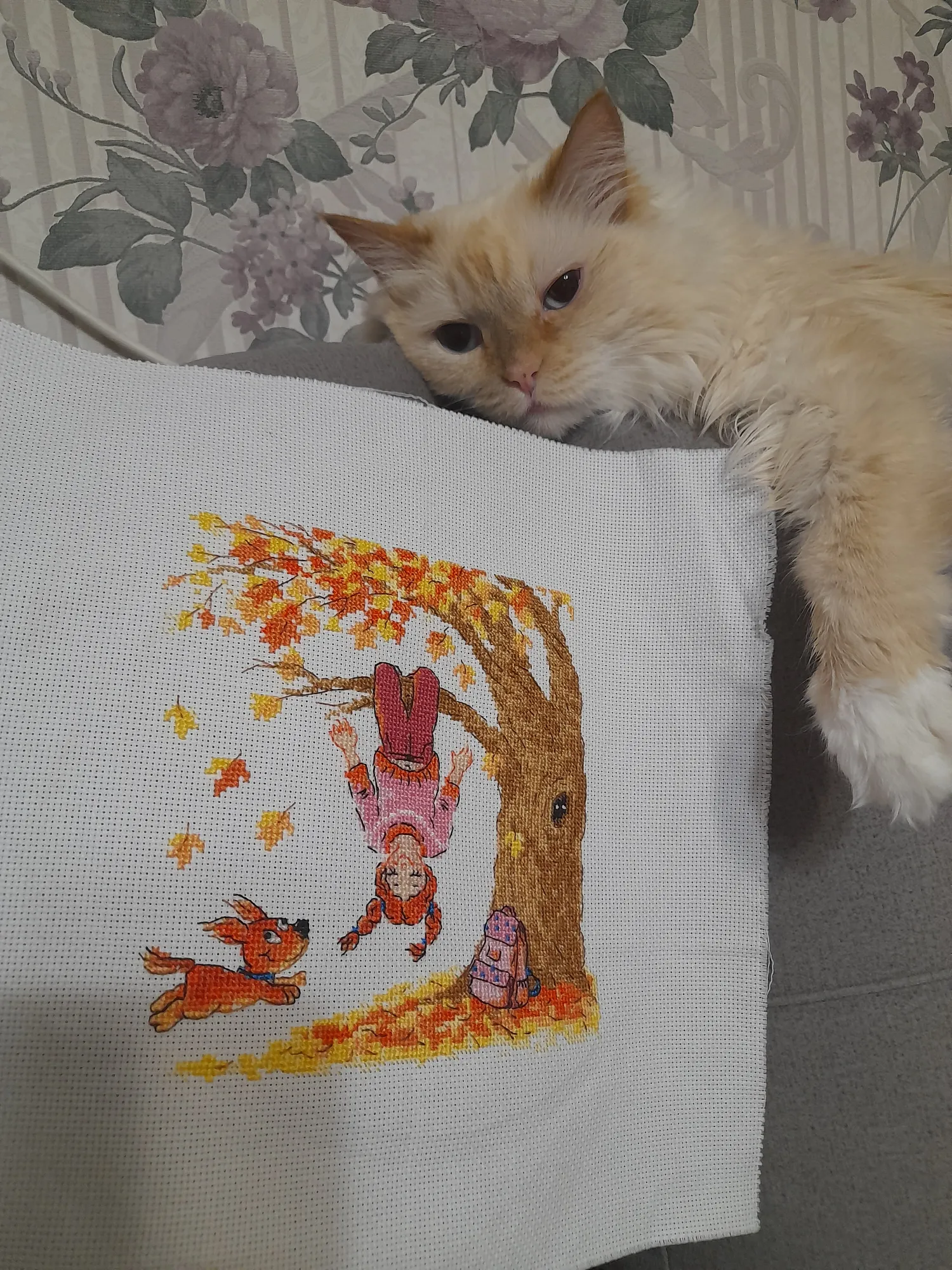 Эта работа была вышита в рамках проекта «Я твоя первая» – в нём авторы ищут первоотшивальщиц для своих схем. Я увидела такое превью и не смогла пройти мимо, поэтому вызвалась выполнить отшив: