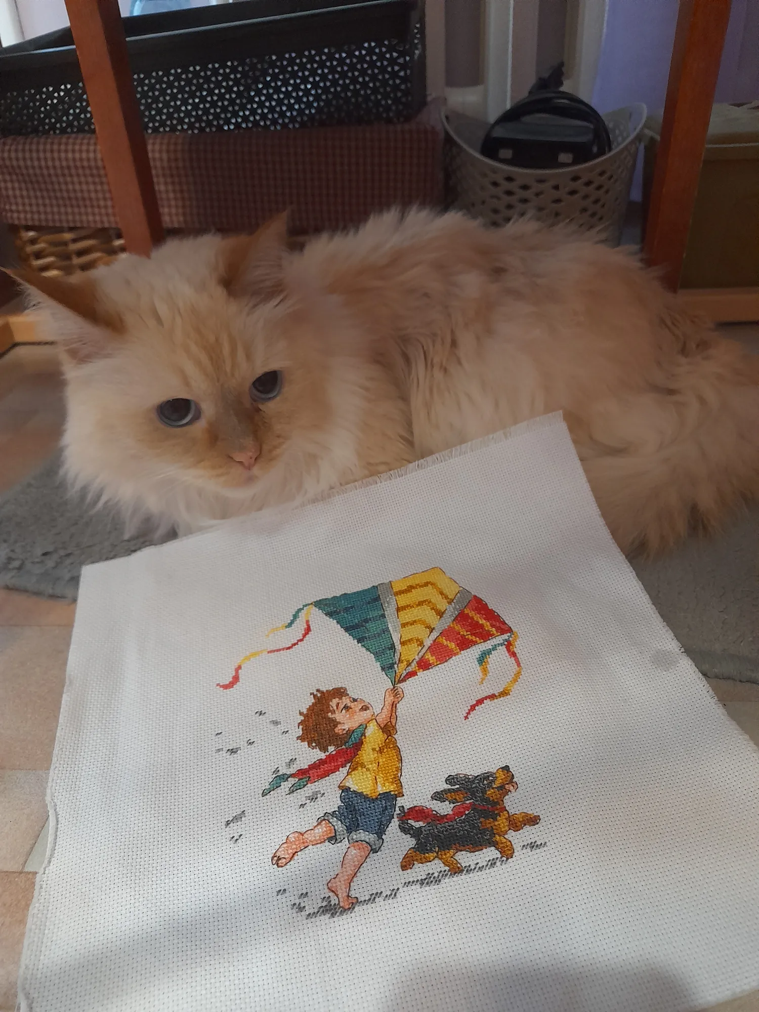 фон зашивается частично, полукрестом. мне не очень нравится сам процесс вышивки полукреста, но здесь, из-за больших однотонных участков, было нормально