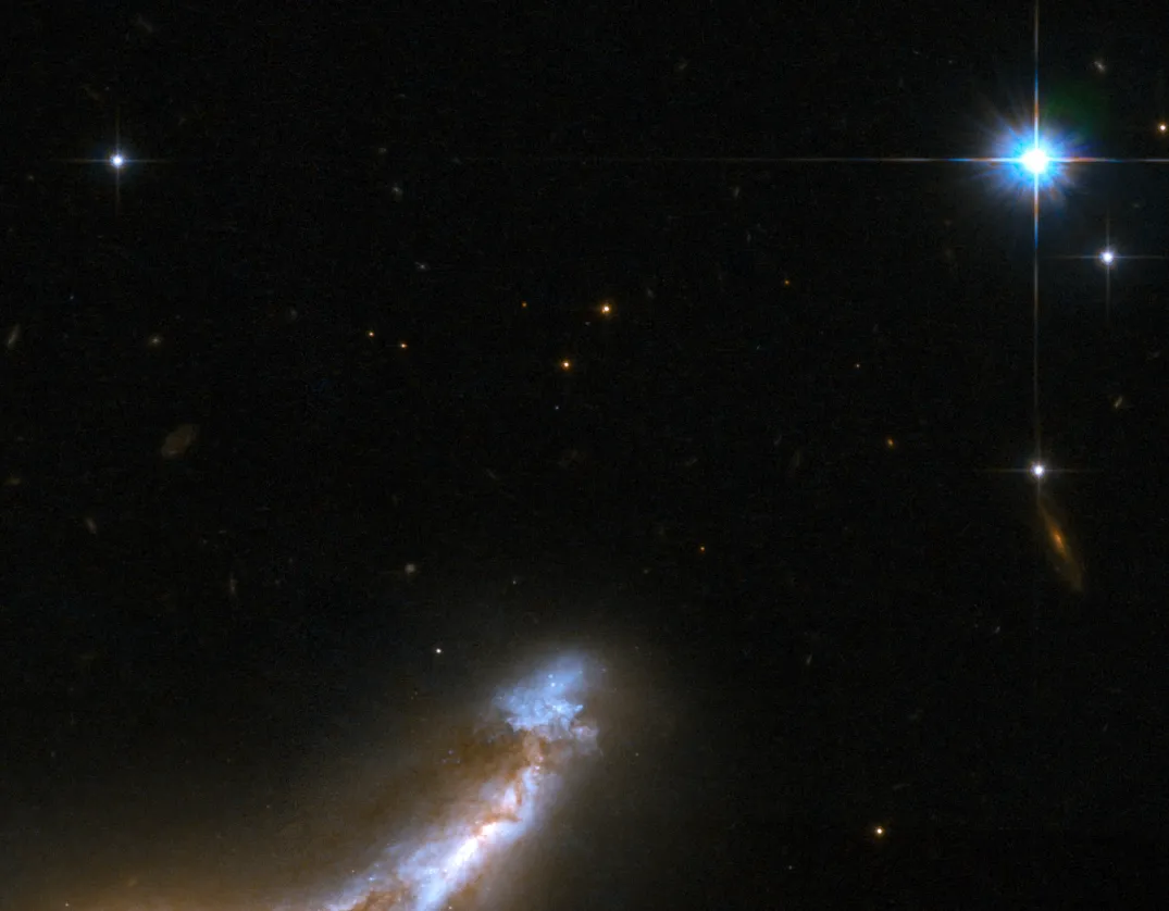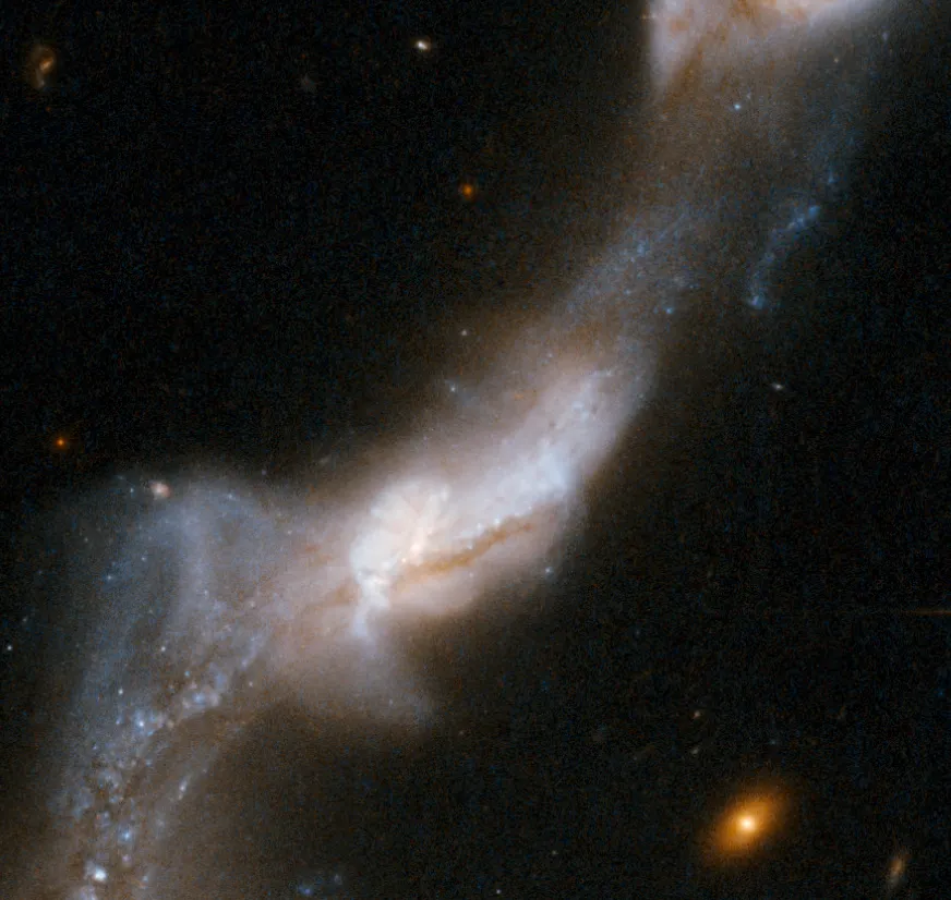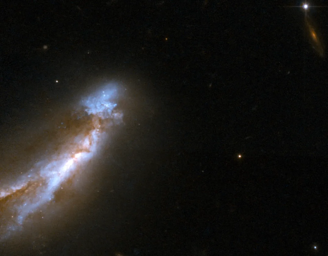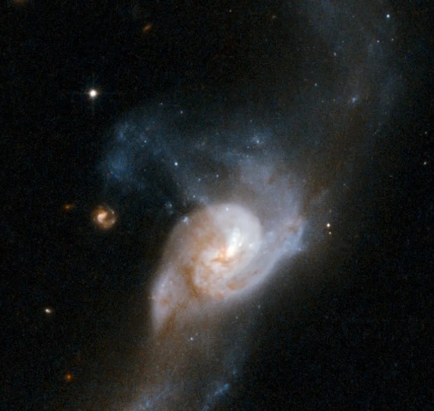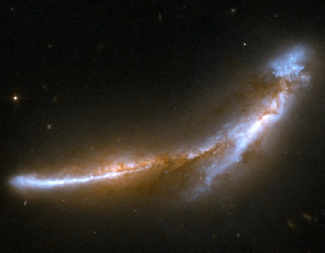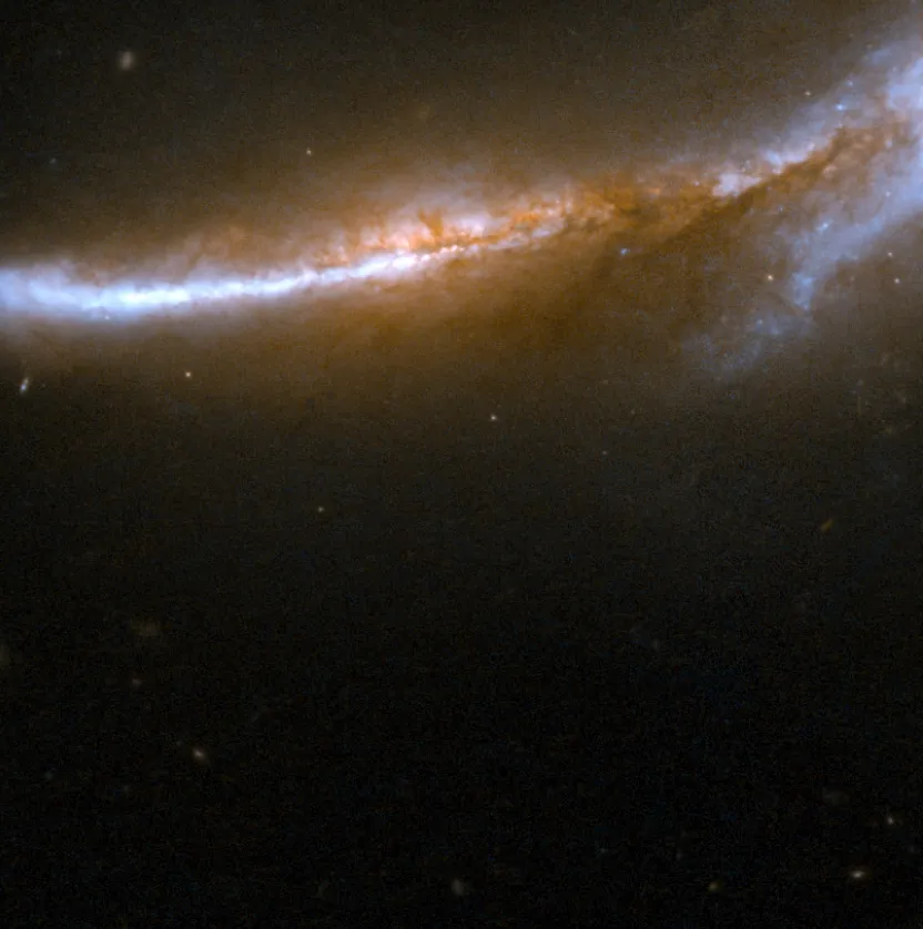 NGC 2146 относится к спиральным галактикам с перемычкой, но её главная особенность — это пылевой спиральный рукав, который, как видно на снимке, изогнулся и проходит прямо перед ядром галактики. Чтобы деформировать структуру галактики и повернуть её на угол до 45 градусов, требуются колоссальные силы. Наиболее вероятное объяснение — гравитационное влияние соседней галактики, которая нарушает орбиты звёзд в NGC 2146. Скорее всего, мы наблюдаем завершающую стадию процесса, длящегося десятки миллионов лет.