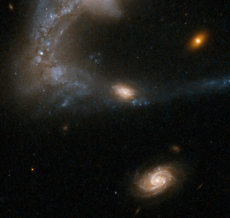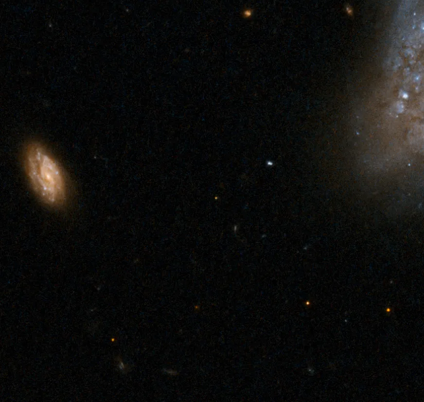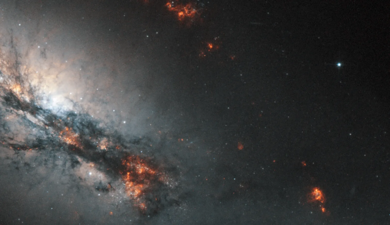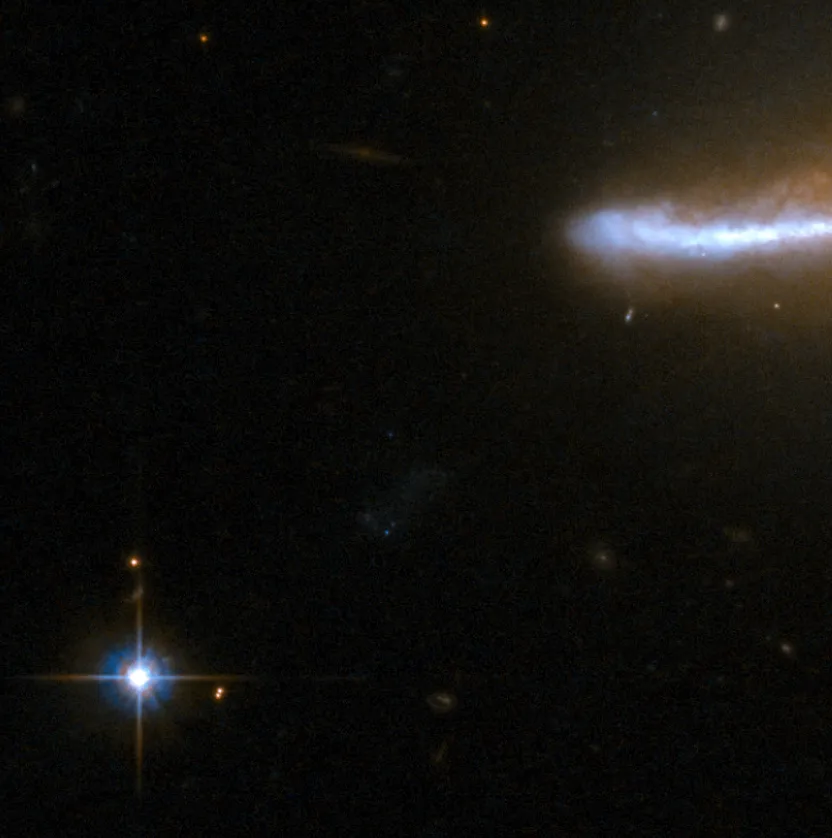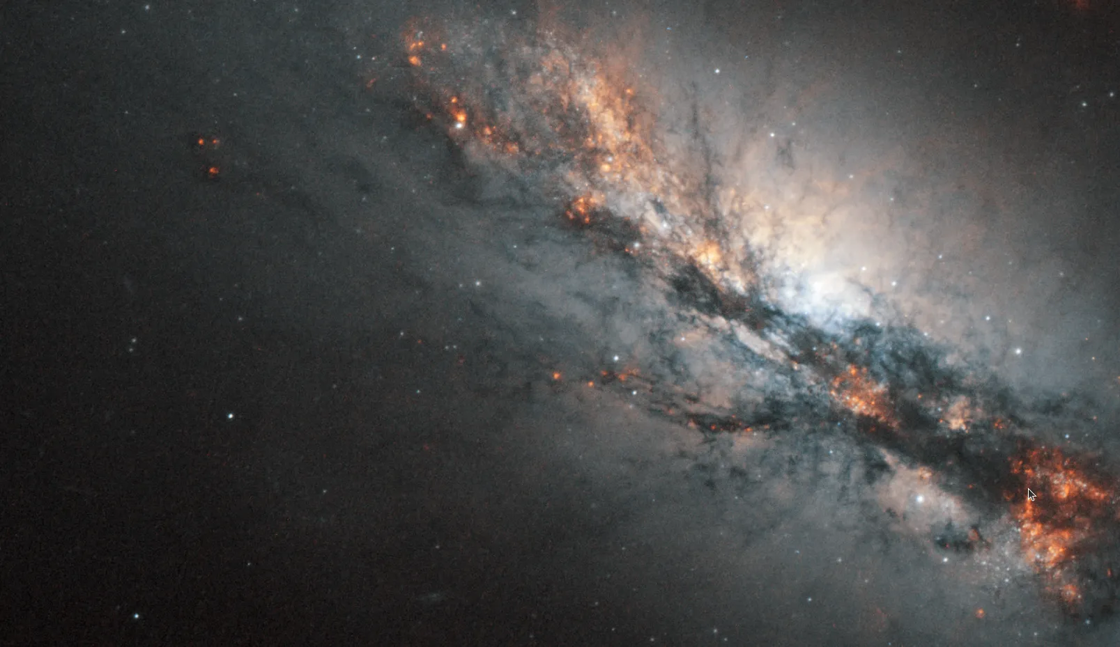 NGC 2146 относится к спиральным галактикам с перемычкой, но её главная особенность — это пылевой спиральный рукав, который, как видно на снимке, изогнулся и проходит прямо перед ядром галактики. Чтобы деформировать структуру галактики и повернуть её на угол до 45 градусов, требуются колоссальные силы. Наиболее вероятное объяснение — гравитационное влияние соседней галактики, которая нарушает орбиты звёзд в NGC 2146. Скорее всего, мы наблюдаем завершающую стадию процесса, длящегося десятки миллионов лет.