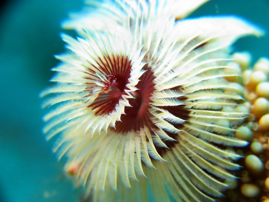 Отличительная черта нашего героя - пара ярких перистых щупалец, свёрнутых в спираль. Они представляют собой видоизменённые пальпы и используются червями для фильтрации планктона и взвешенных в воде частиц, а также для газообмена. По сути это и рот и жабры в одном флаконе. Одна из ветвей щупалец видоизменяется в оперкулюм - плотную крышечку, закрывающую вход в трубку, когда червь полностью втягивается внутрь. Окраска щупалец может быть самой разнообразной: красной, белой, синей, пёстрой.