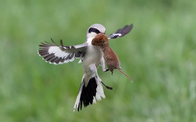 Птиц охотник может преследовать и в воздухе, на короткой дистанции ему хватает скорости догнать воробья или синицу (птичку жалко )-; ). Сорокопут на столько входит в боевой раж (как настоящий берсеркер), что может выхватить перепуганную добычу даже из рук человека, если та каким-то образом у него оказалась. Когда добыча поймана, сорокопут ее убивает и уносит в когтях (как настоящий орел) на свой «кормовой столб» для разделки добычи (ну натуральный мясник).