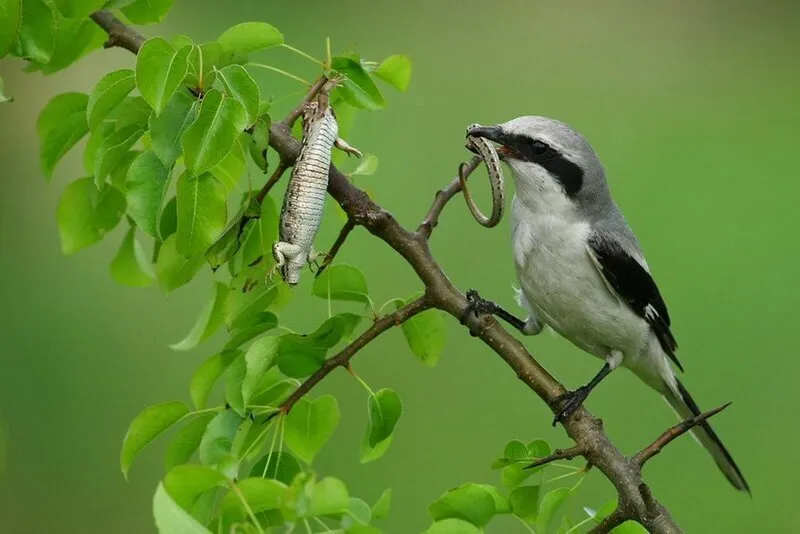 Если бы не размер, сорокопута можно спутать с самкой снегиря, но ястребиный клюв как бы намекает, что снегири тут рядом не летали. Серый сорокопут стал настоящим безжалостным хищником, не смотря на свои скромные размеры. В основном он охотится на лягушек, ящериц, грызунов и других птиц, хотя крупными насекомыми он тоже не брезгует (был бы он покрупнее, и тебя бы съел).