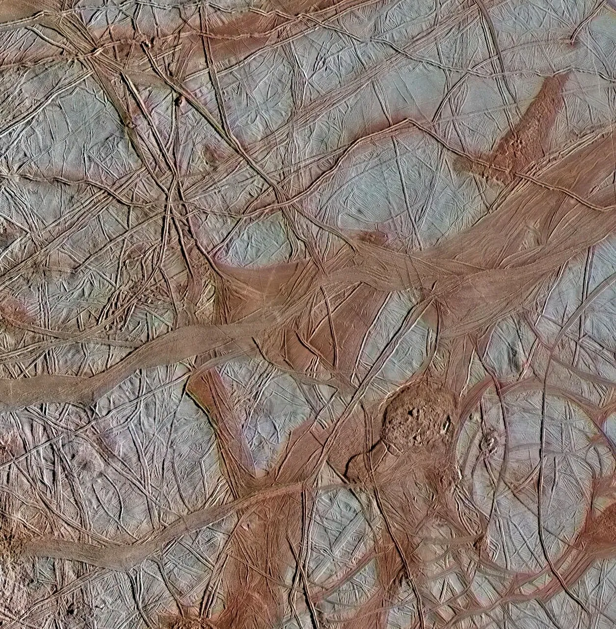 На этом снимке, полученном космическим аппаратом «Галилео» 26 сентября 1998 года во время близкого облета спутника Юпитера Европы, показан участок ее ледяной коры в экваториальном районе.
