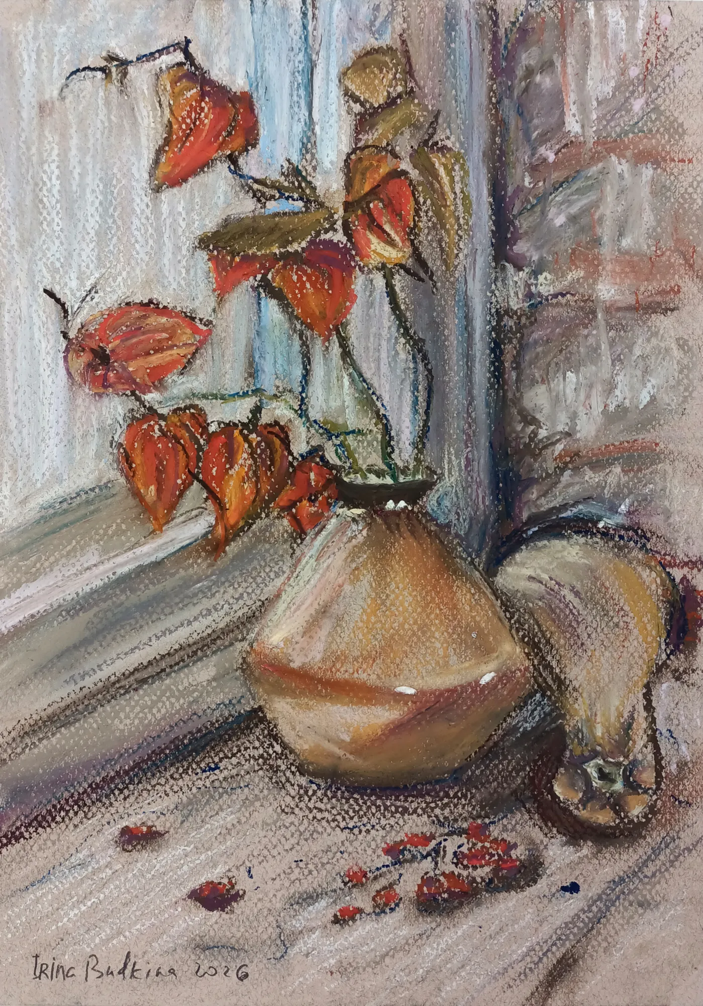 Дома у меня есть три причины не рисовать с натуры: Фаня, Чернушка и Ириска, поэтому очень люблю ходить на мастер-классы в чужие мастерские. Эта работа - вторая попытка потрогать масляную пастель. Чуть более убедительная, чем первая, но до акварели ей не дотянуться: слишком легко ей работать )