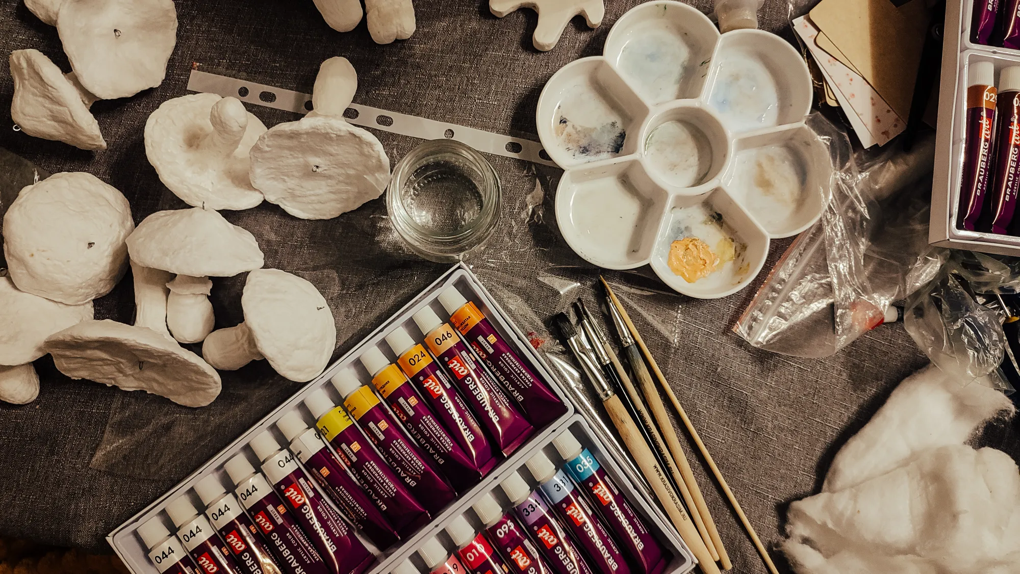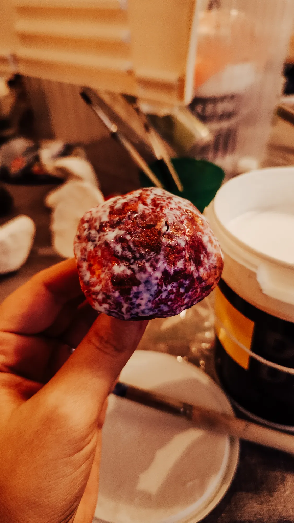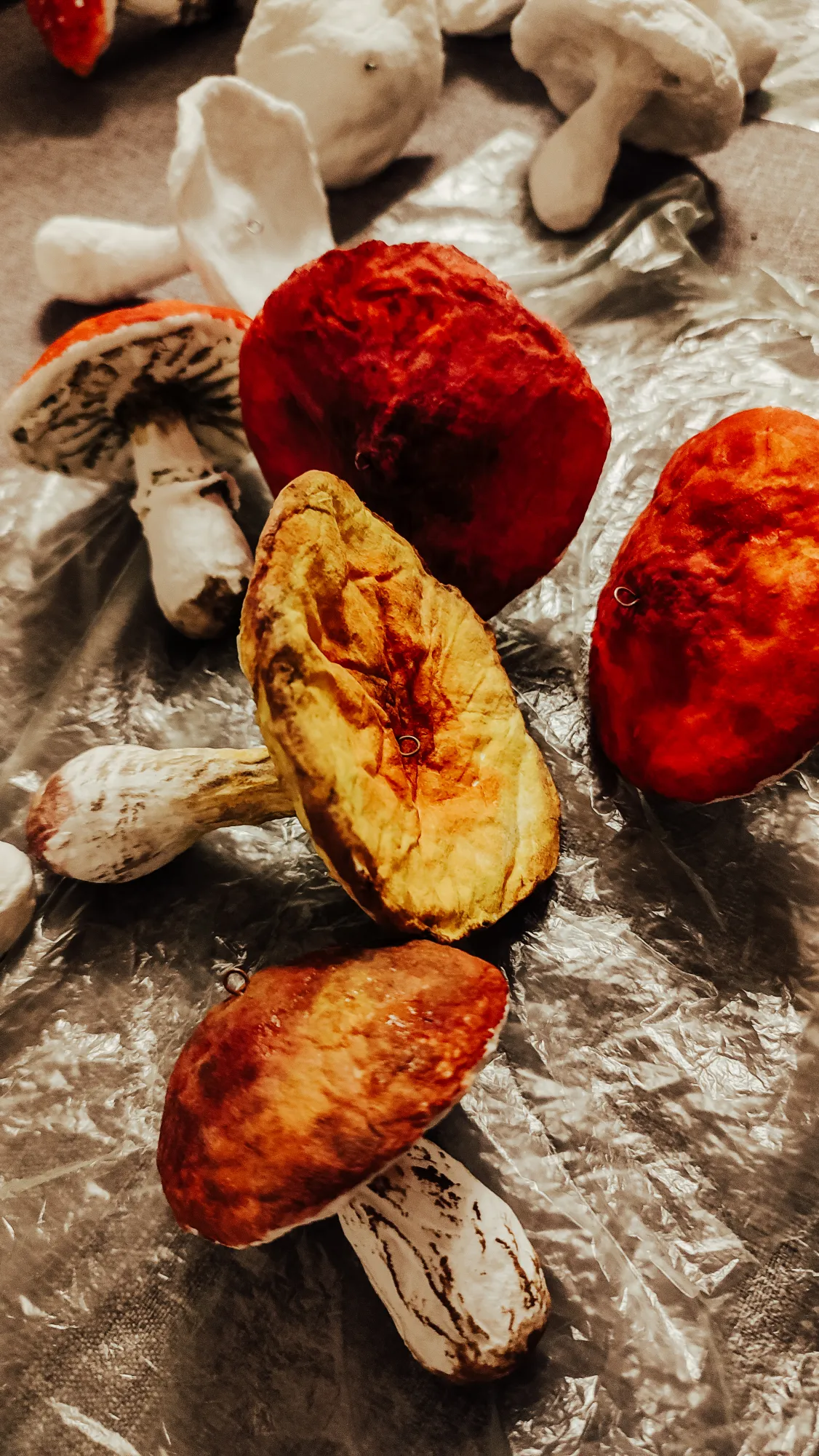 Дальше пока мухоморам добавлялись точки, и по мелочи доделывалось, я один гриб решила покрыть акриловым лаком, посмотреть что получится