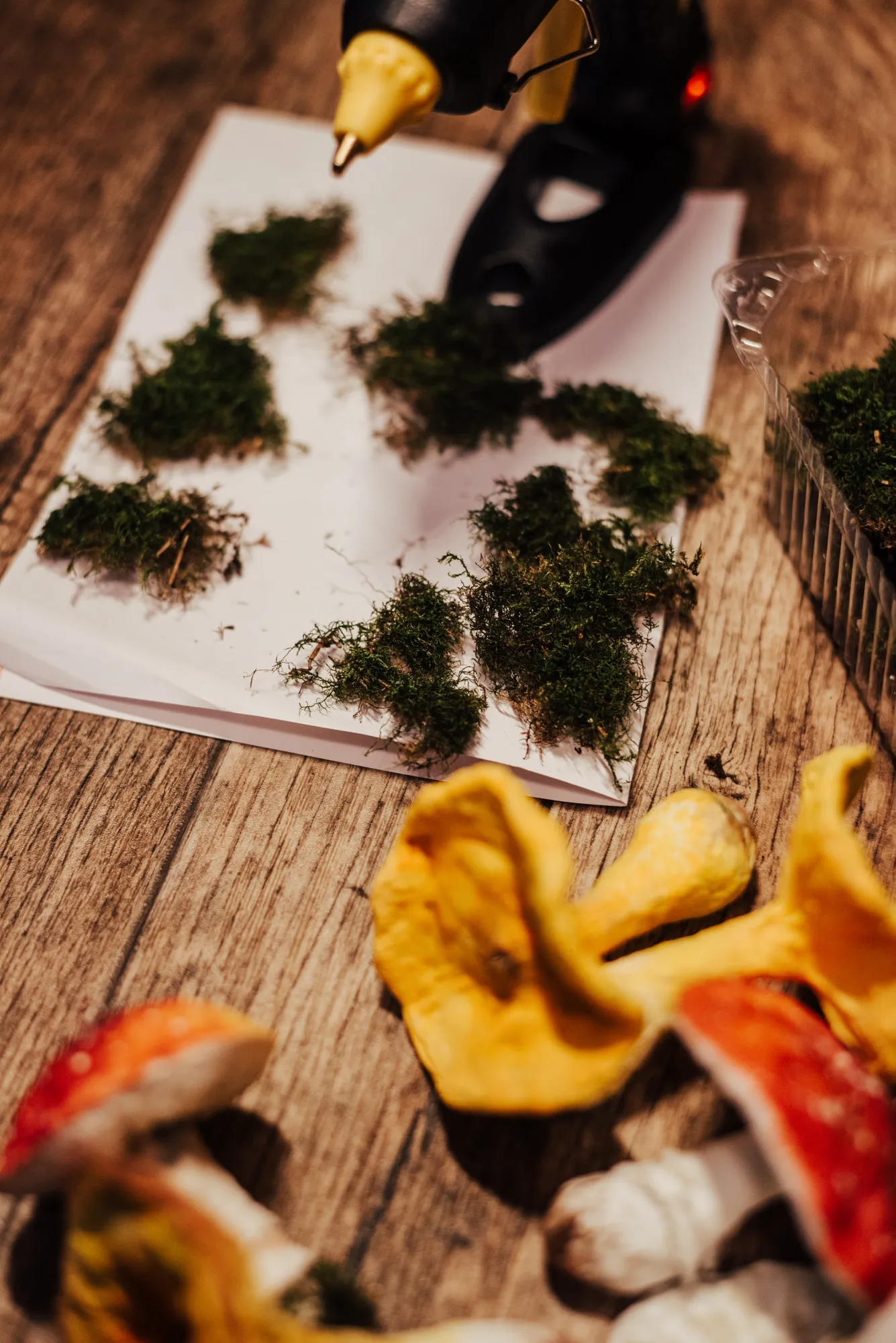 Теперь этот мох поделила на клочки и налепила на грибы, чтоб атмосфернее было)