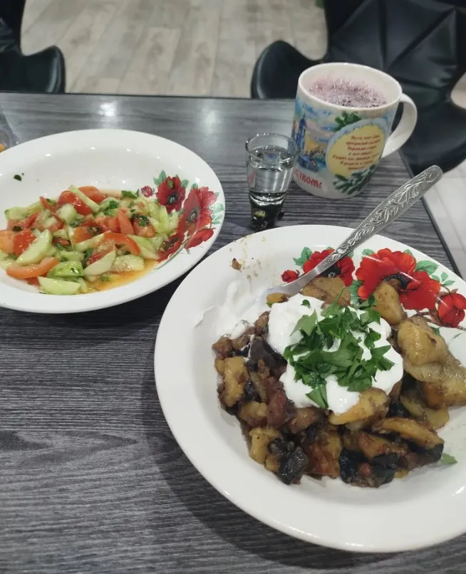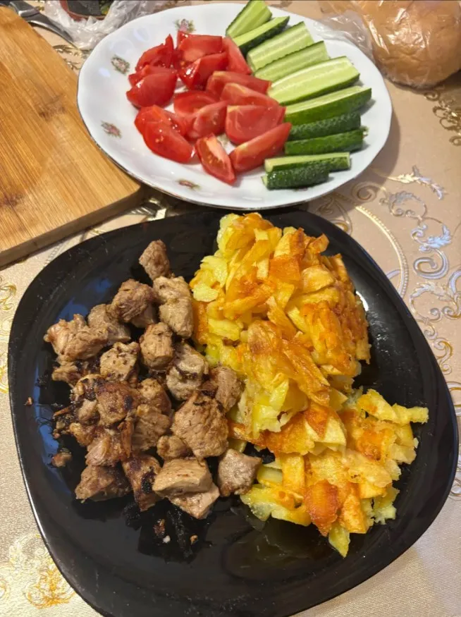 @Kerhan пожарил красивущую картошку. С мясом и грибами. И дополнил её свежими овощами. Цвет картошечки просто кулинарную эрекцию вызывает!