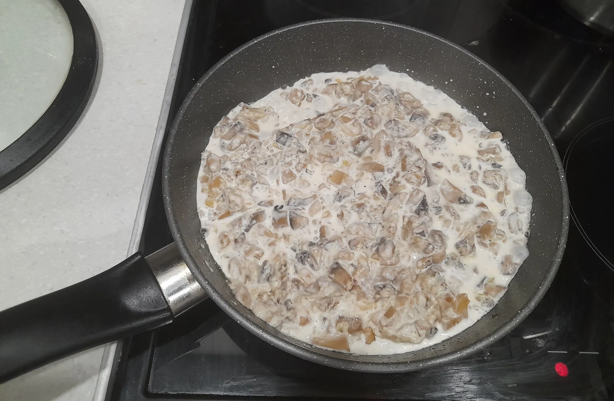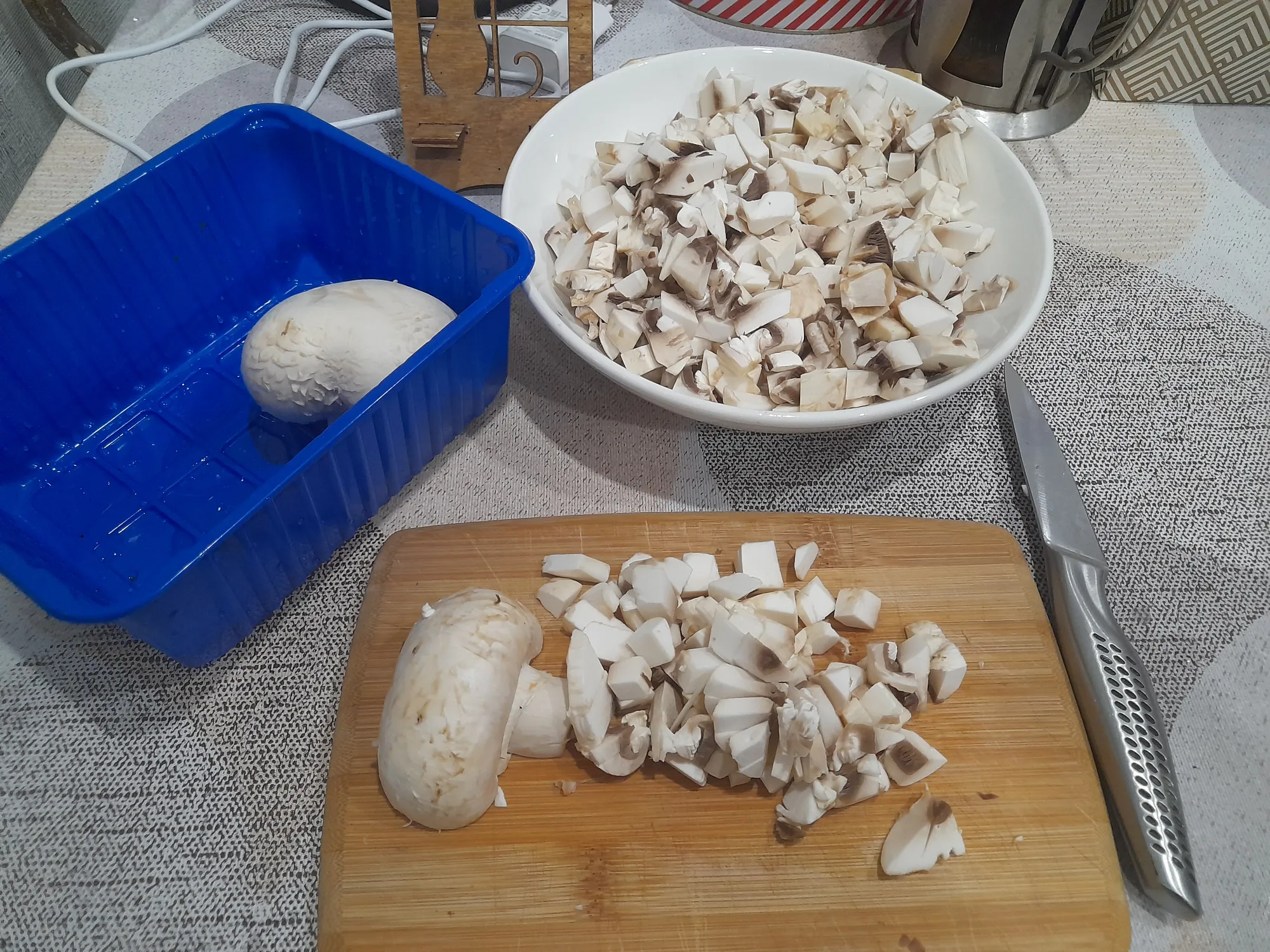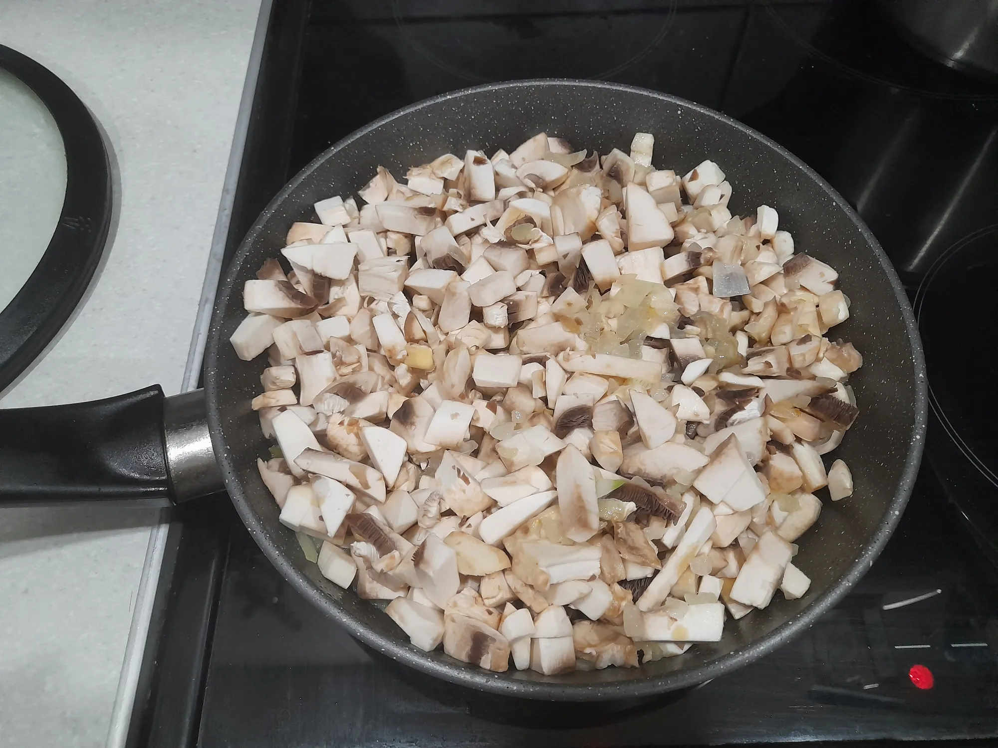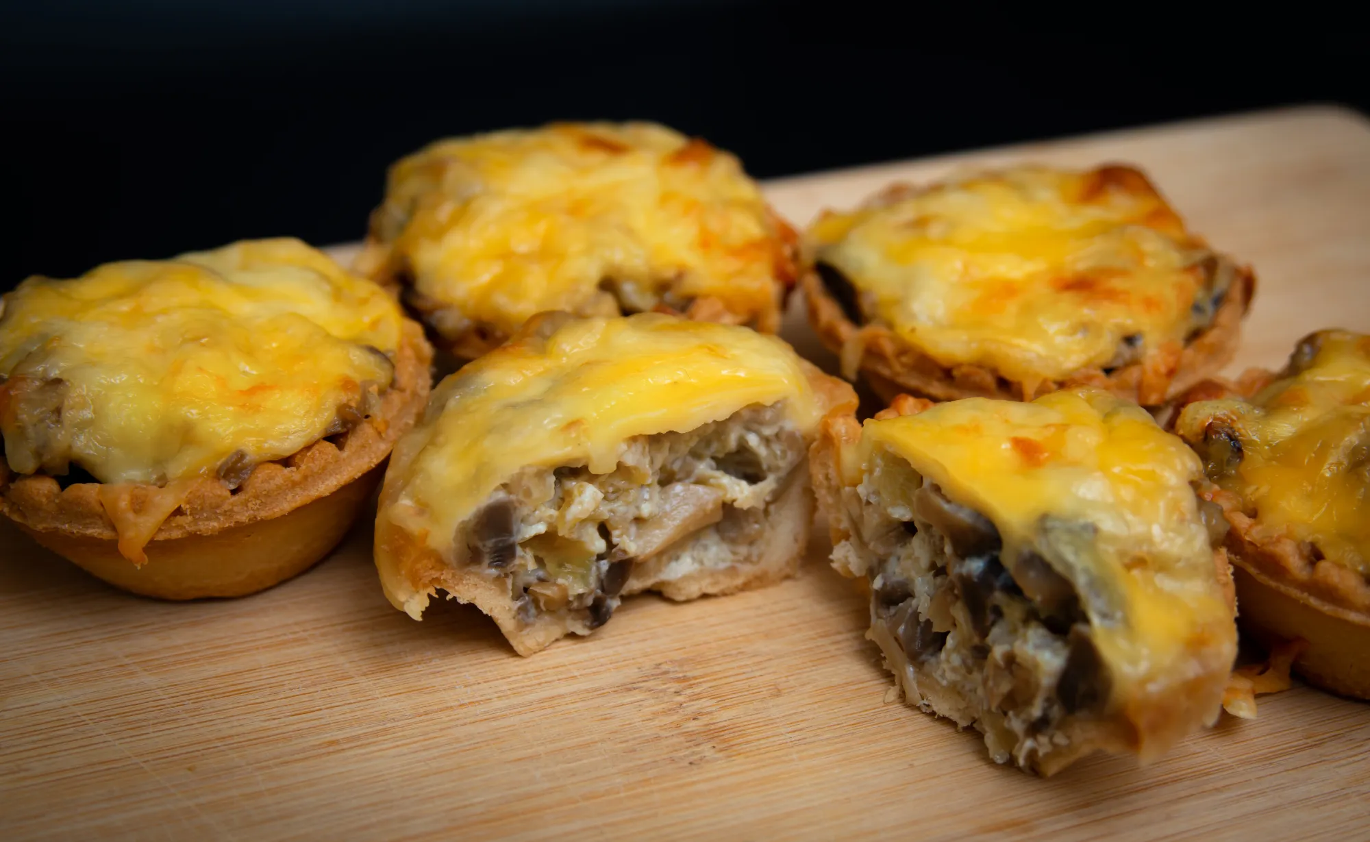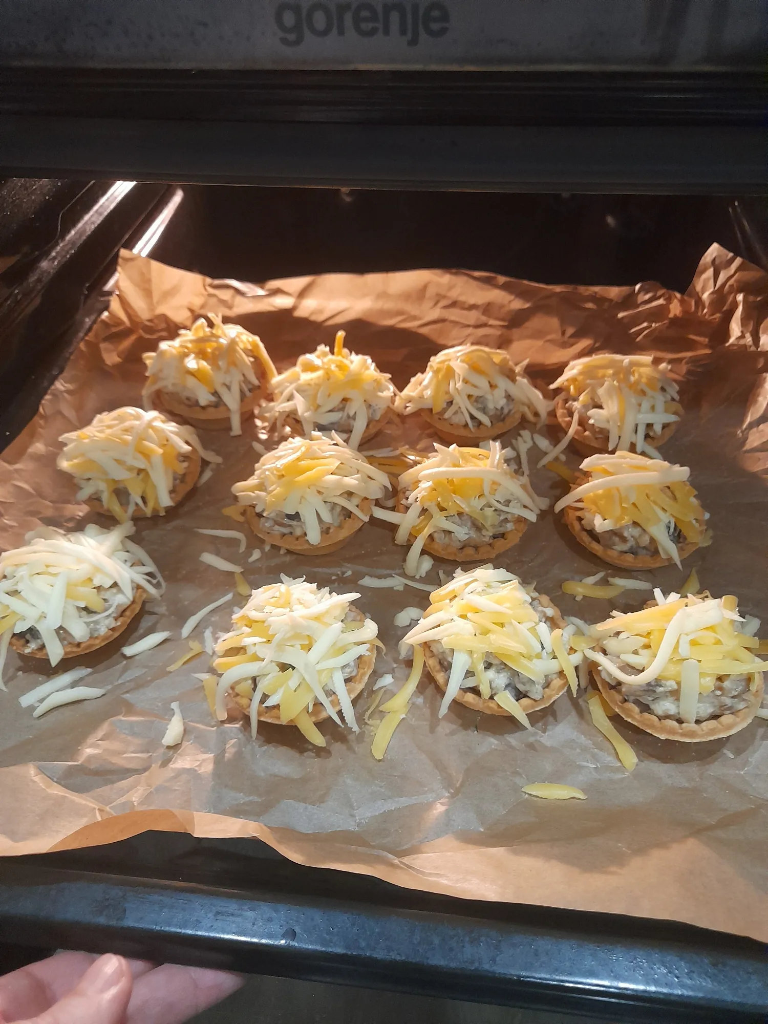 Свежие шампиньены( 400 гр) и лук (2 шт) мелко нарезать и обжарить до выпаривания лишней жидкости. Добавить сливки 20%( 250 мл- у меня ушло чуть меньше), посолить (это мы благополучно забыли, и потом досаливали уже в тарталетках), поперчить ( вообще не стали). Добавить крахмал для густоты( 1-2 ст. ложки). Разложить по тарталеткам, посыпать мелко натертым сыром( я натерла на крупной терке, а зря, все вываливалось мимо, просто пропустила мимо ушей, что трем на мелкой терке). Запекать в духовке на 180 градусов 10-15 минут.