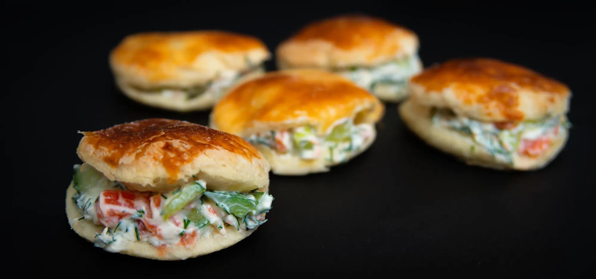 Немного раскатать лист слоеного теста( я брала упаковку 500 гр, там два листа, мне хватило), разделить на кругляшки с помощью стакана, намазать желтком и посыпать кунжутом( у нас кунжут закончился, оказывается, без него). Выпекать в духовке на 180 градусов 10-15 минут. Начинка: свежий огурец(1 штука), слабосоленый лосось ( 250 гр), укроп, творожный сыр( 1 баночка). Разрезать (я разломила) получившиеся мини-булочки на пополам и выложить начинку. Готово.