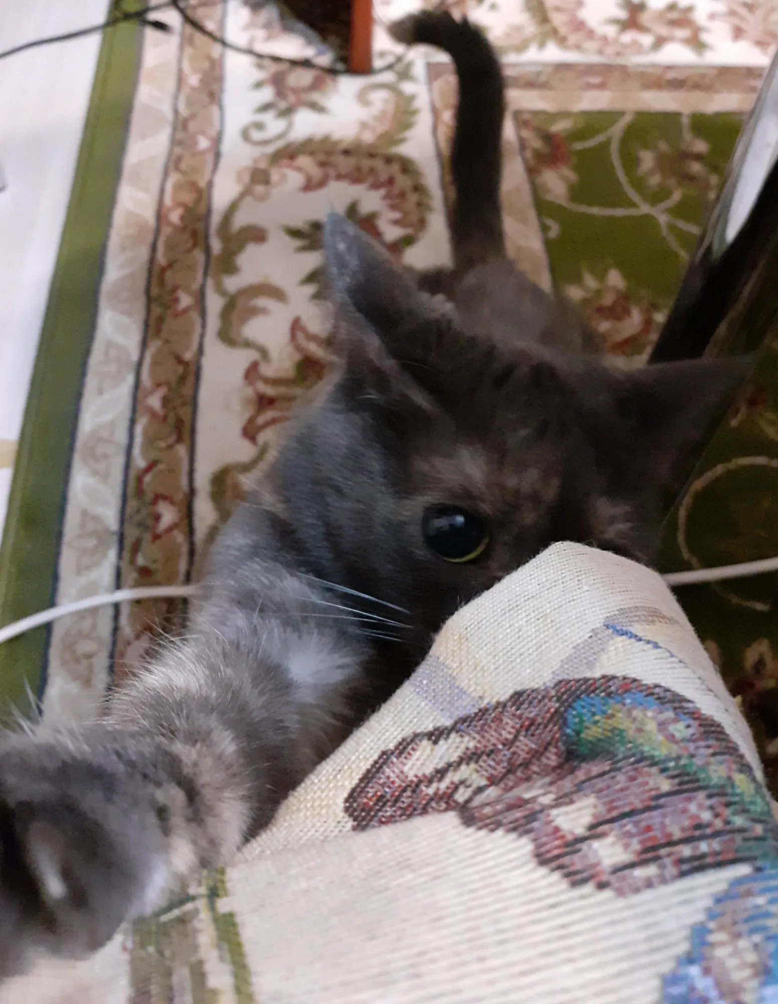 Пришла к нам сама ещё котёнком. Смотрит на всех как на говно. Иногда требует любить, и тогда нет никакой возможности избежать котькиной любви. Мышелов.