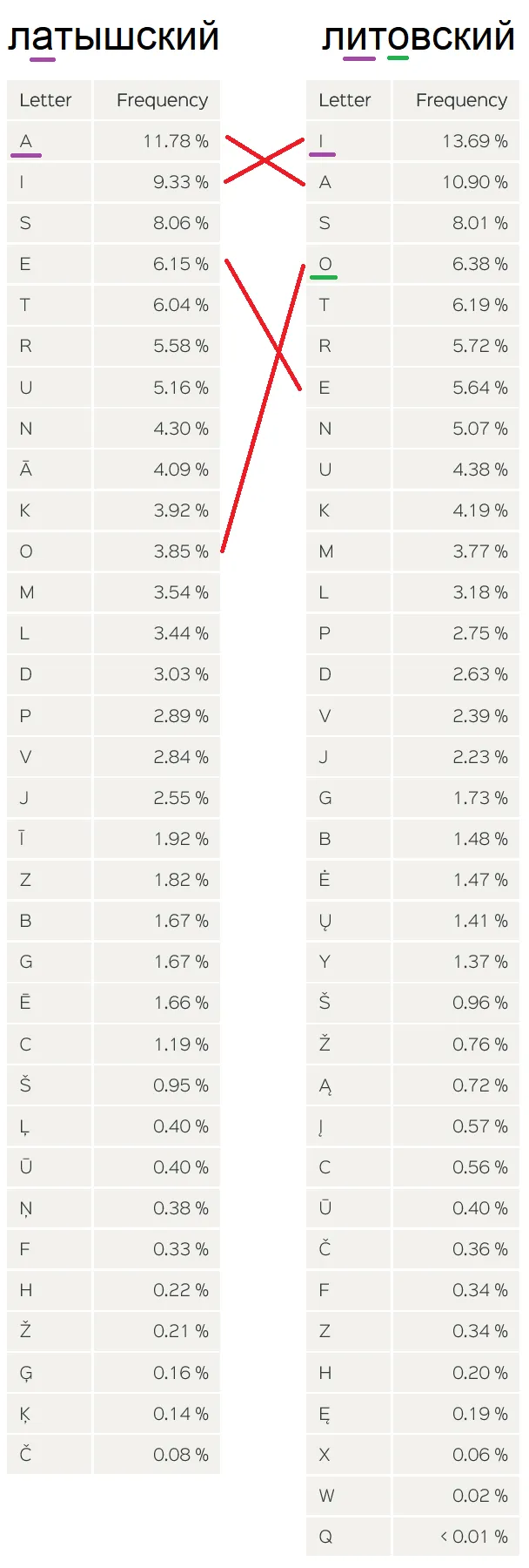 Первое, что бросатся в глаза — отличаются самые частые гласные. В лАтышском это А, в лИтовском — И. Запомнить очень просто. Также посмотрите на очень большую разницу в использовании буквы О. ЛитОООвский, верно? Ну и буква Е в латышском встречается чуть чаще. Разница не такая значительная.