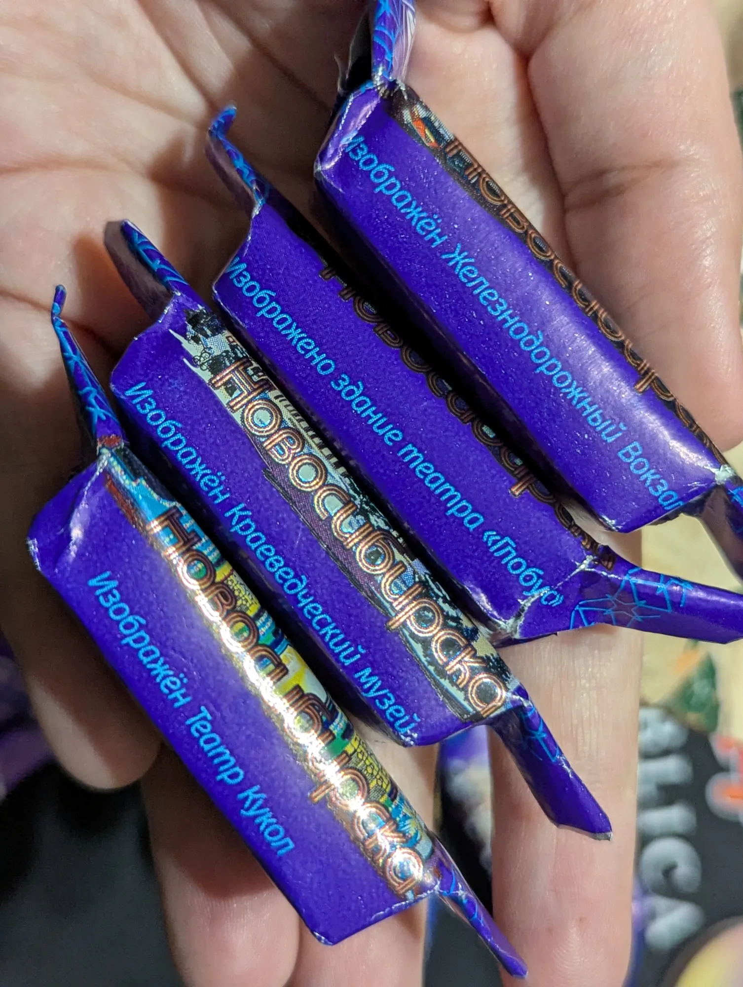 Внутри оказались конфеты с Новосибирскими достопримечательностями. Часть суну к конфетам с Красноярскими – пусть дружат!! Закидываю конфету в рот (вкусную, кстати! люблю такие) и продолжаю изучение.