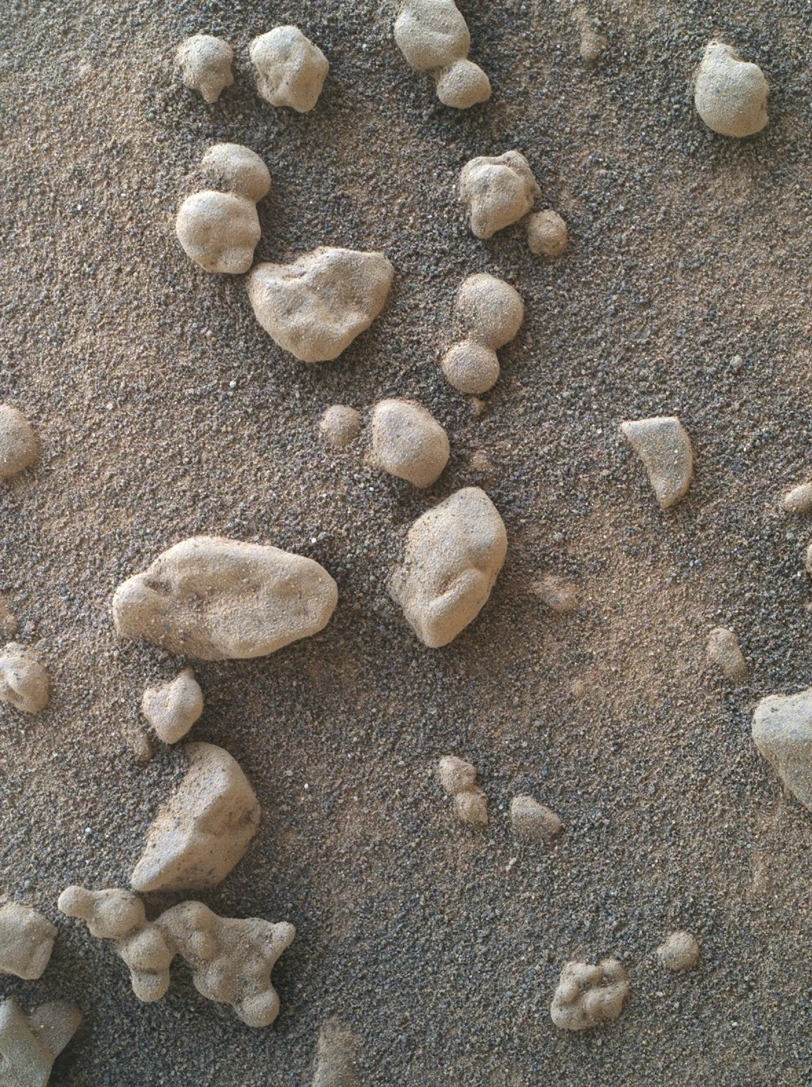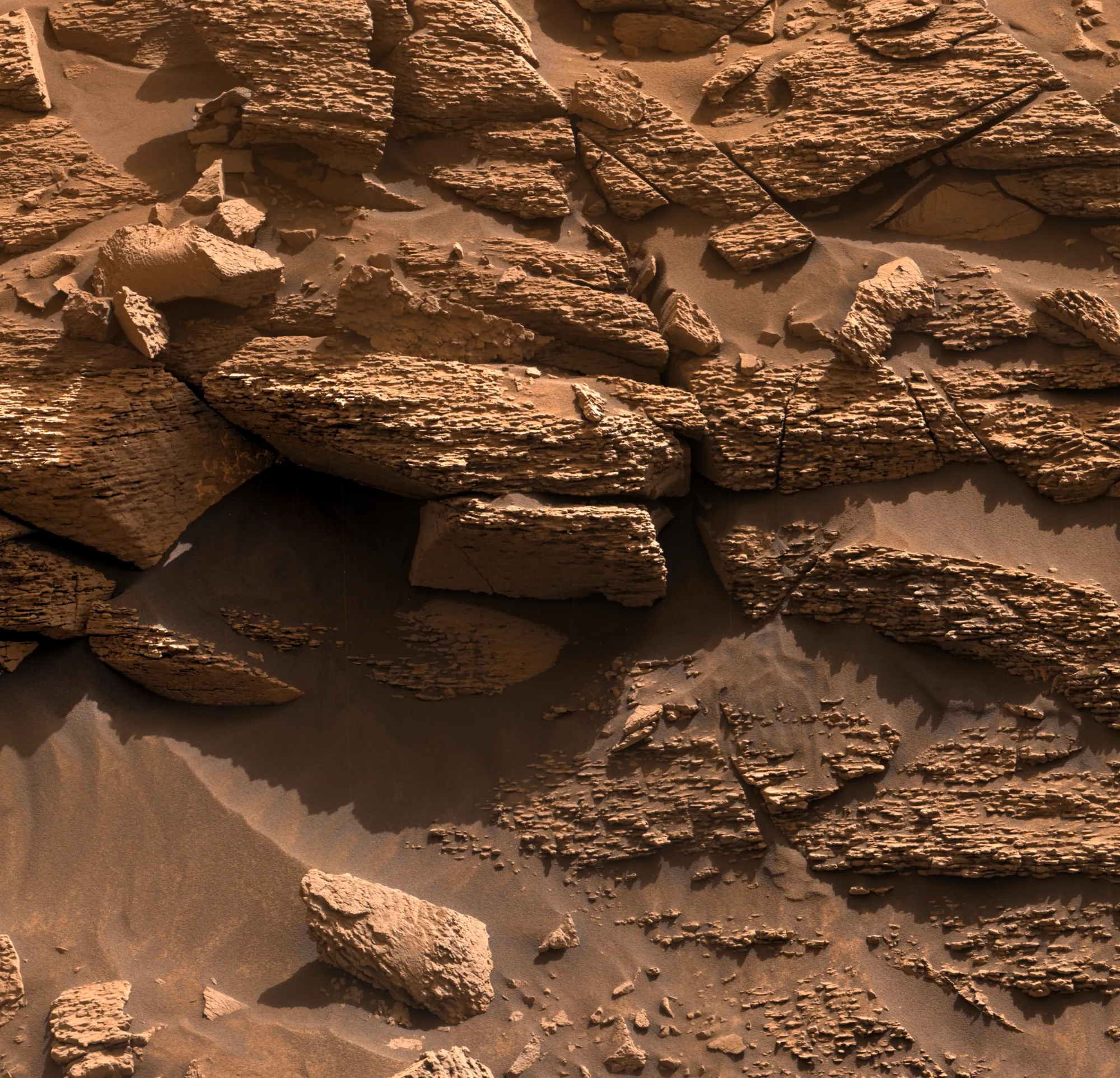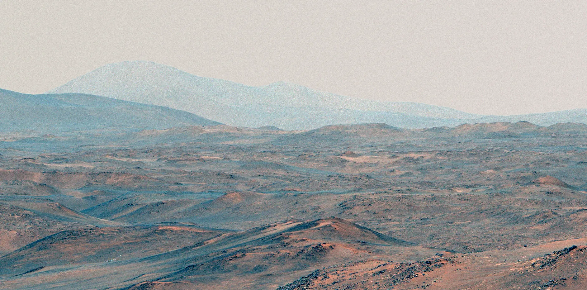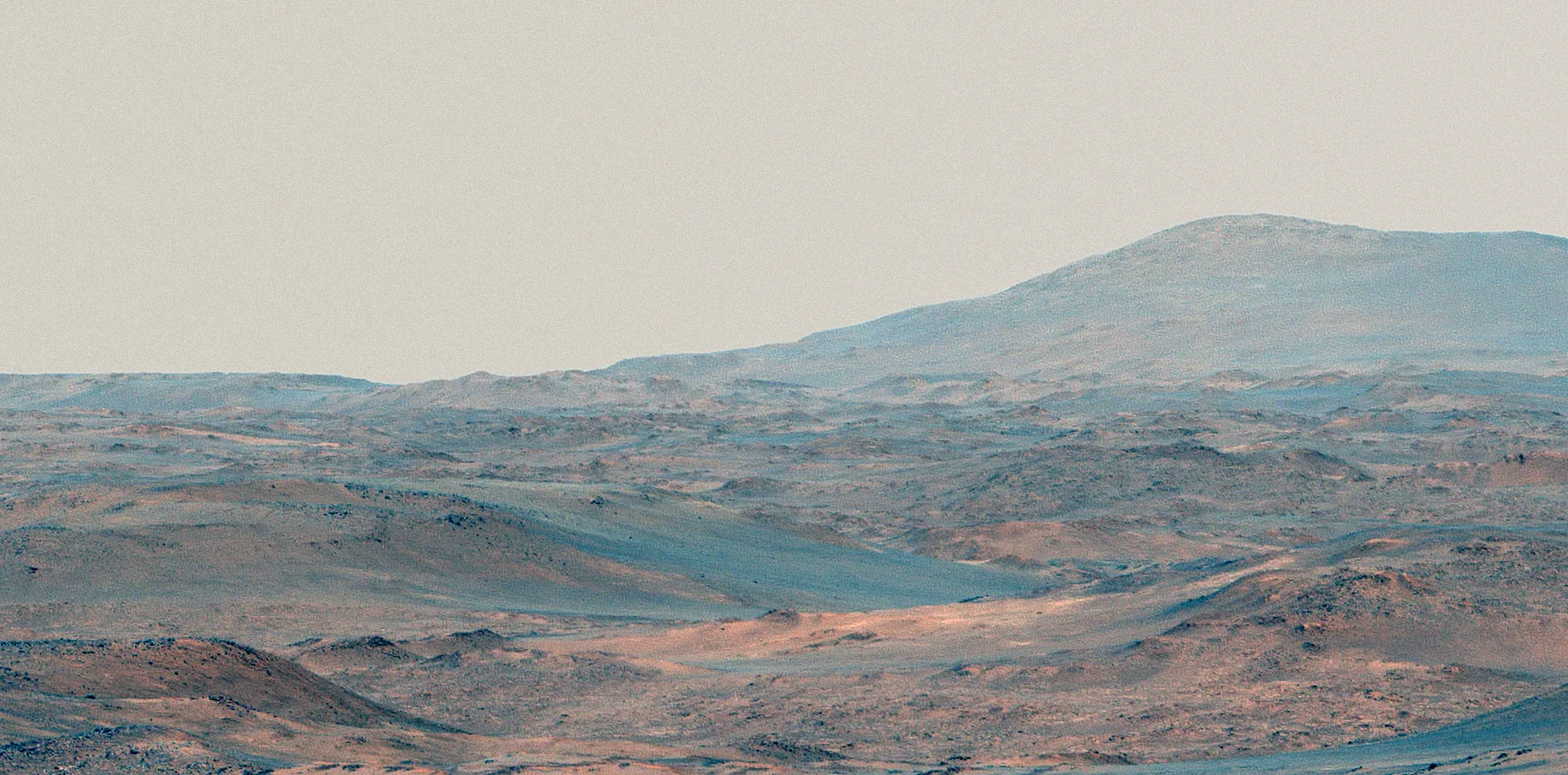 Эта изображение в естественных цветах создано из трёх отдельных снимков. Каждый из них был сделан с использованием всех светофильтров камеры Mastcam-Z, чтобы передать цвета как можно точнее и помочь учёным заранее оценить разнообразие минералов в этом районе до того, как марсоход туда заедет.