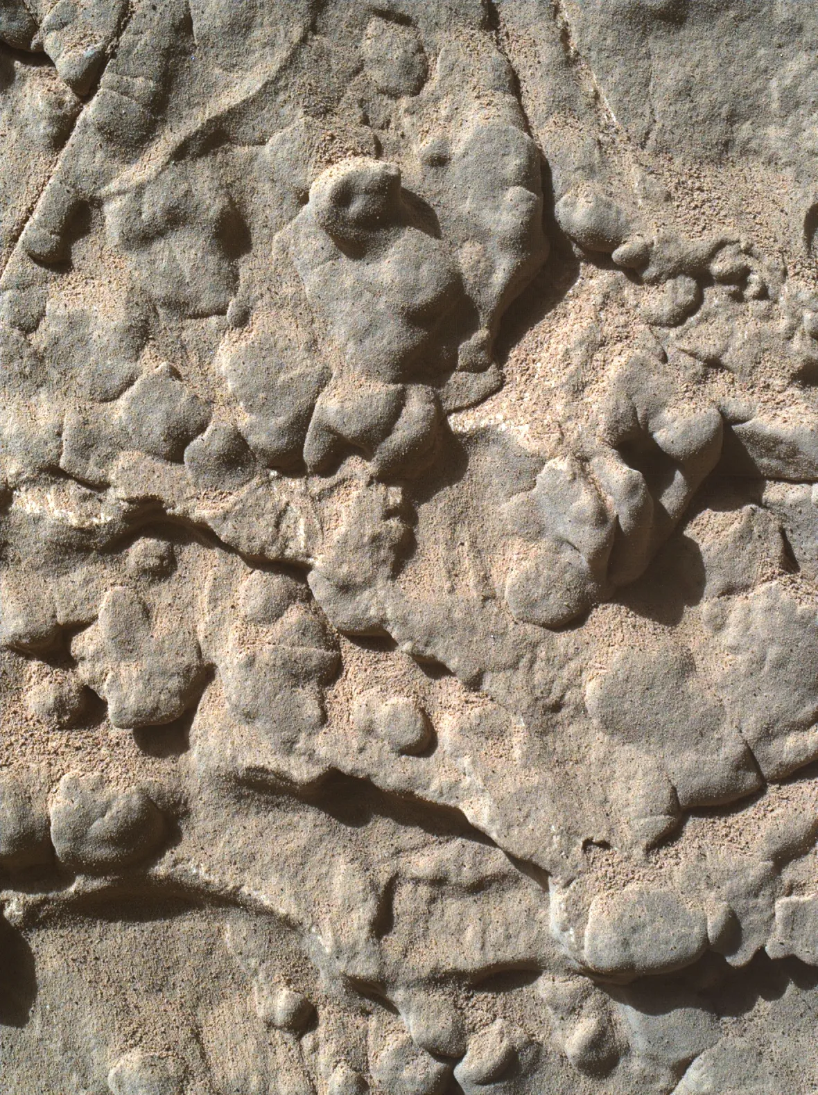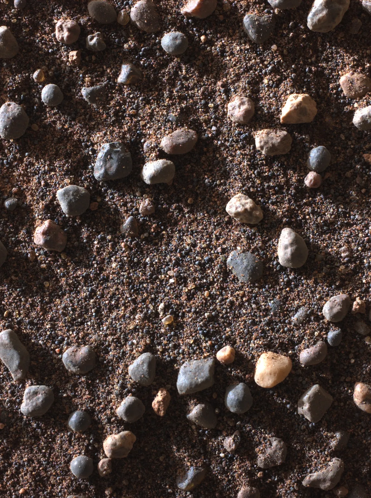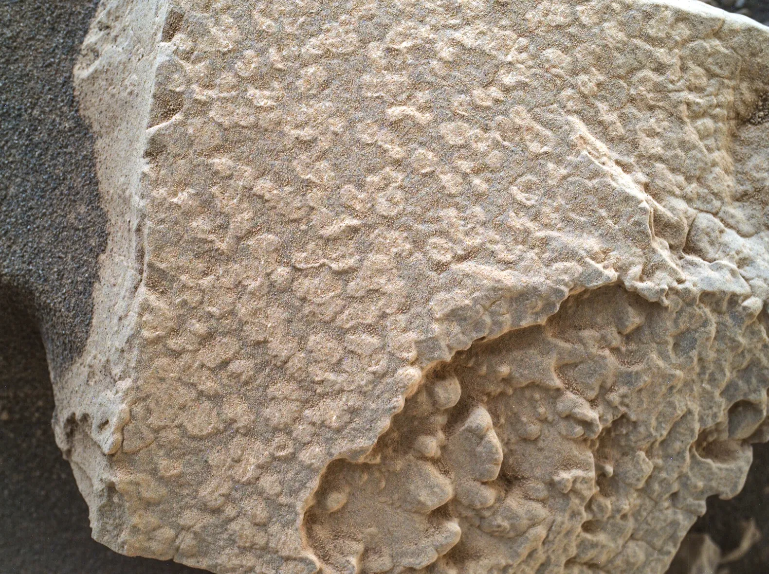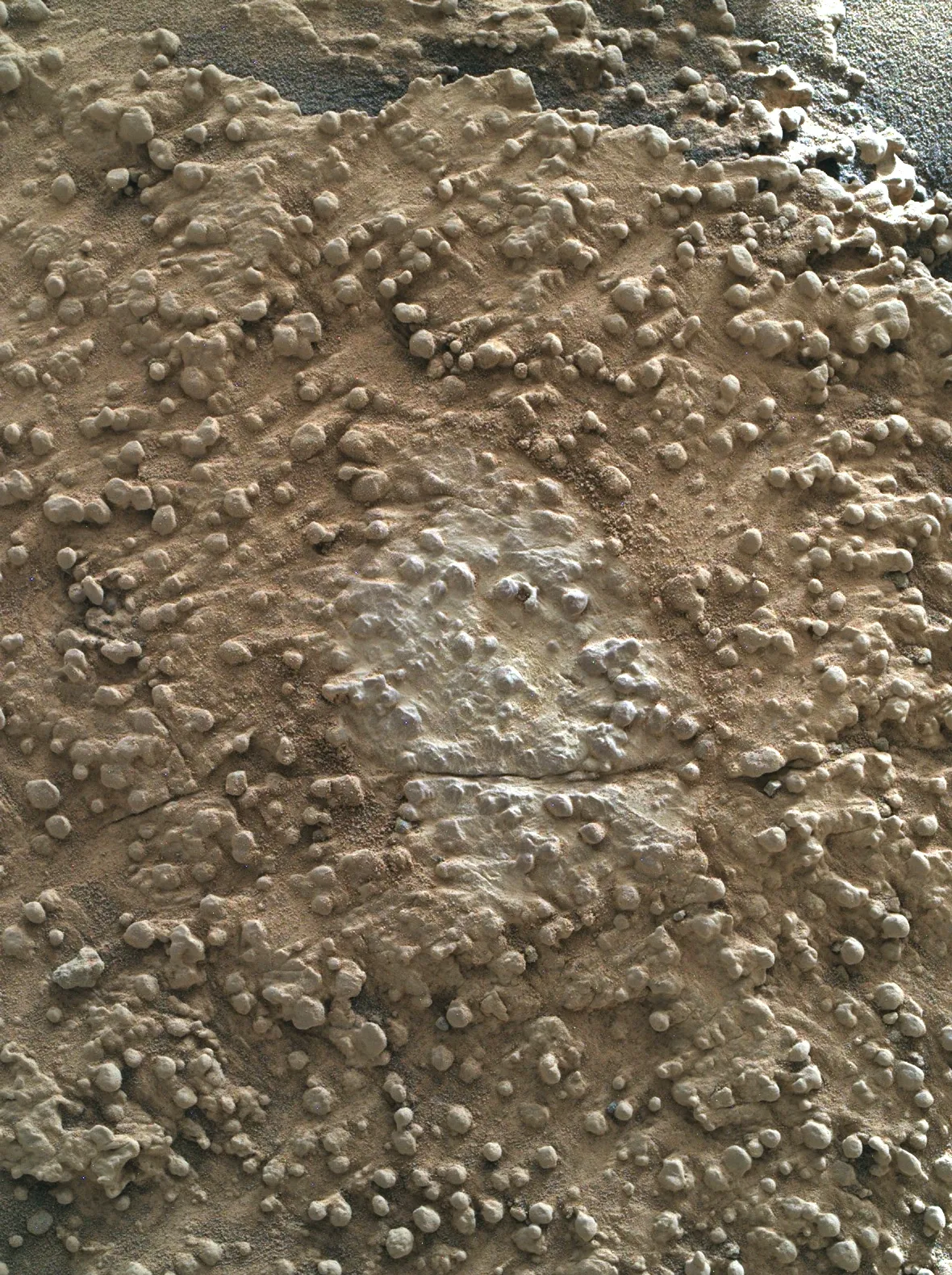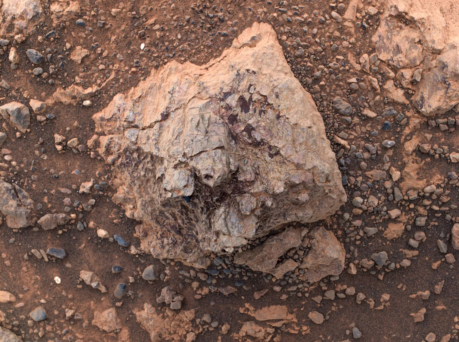 Эта изображение в естественных цветах создано из трёх отдельных снимков. Каждый из них был сделан с использованием всех светофильтров камеры Mastcam-Z, чтобы передать цвета как можно точнее и помочь учёным заранее оценить разнообразие минералов в этом районе до того, как марсоход туда заедет.