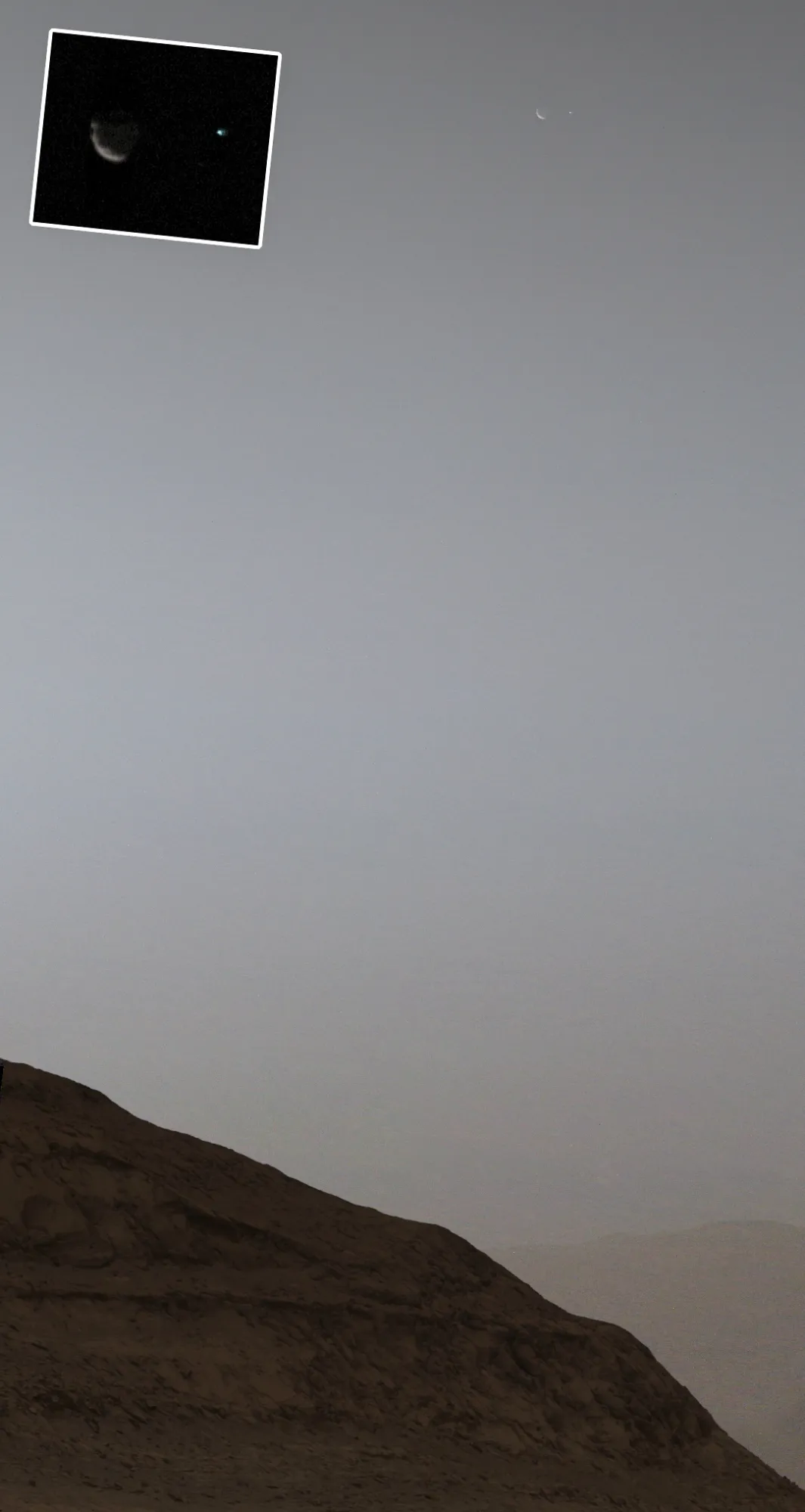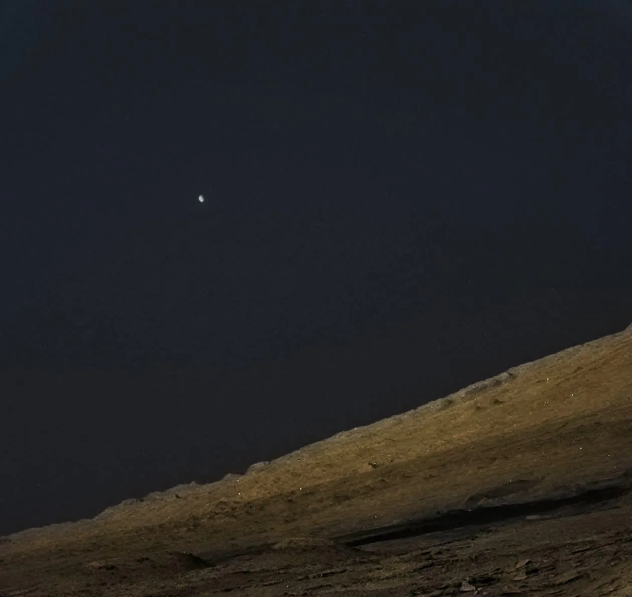 Эту 5-километровую гору ровер исследует с 2014 года, постепенно поднимаясь по её склонам. А два объекта в небе, попавшие в кадр - это один из двух спутником Марса - Фобос (серп слева) и Земля (точка справа).