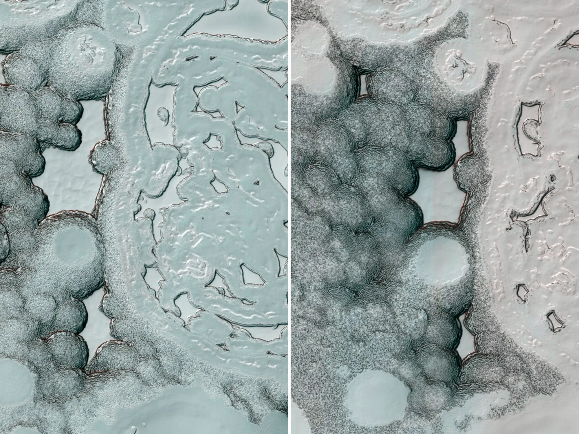 Этот снимок был сделан 23 марта 2015 года (справа). Тот же участок снимали ранее — 28 августа 2007 года (слева). Сложно поверить, что это одно и то же место. Возвышенные плато уменьшились примерно вдвое по сравнению с 2007 годом, а низменности между ними заполнились новыми слоями углекислого газа.