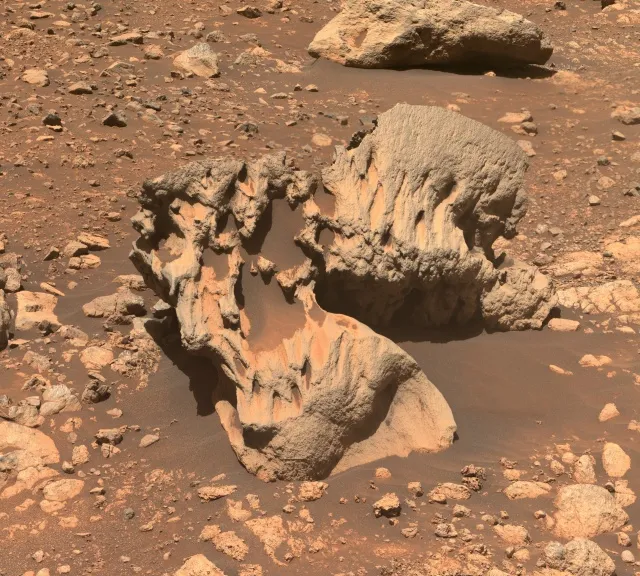Камень сразу бросился в глаза: высокий, скульптурный, словно вылепленный — посреди плоских местных обломков. Perseverance засёк его 2 сентября 2025 года камерой Mastcam-Z, а затем «прощупал» лазерным инструментом SuperCam. Результат анализа показал железо-никелевый состав — именно из такого материала состоят ядра крупных астероидов. Размер находки внушительный: около 80 сантиметров в длину.
