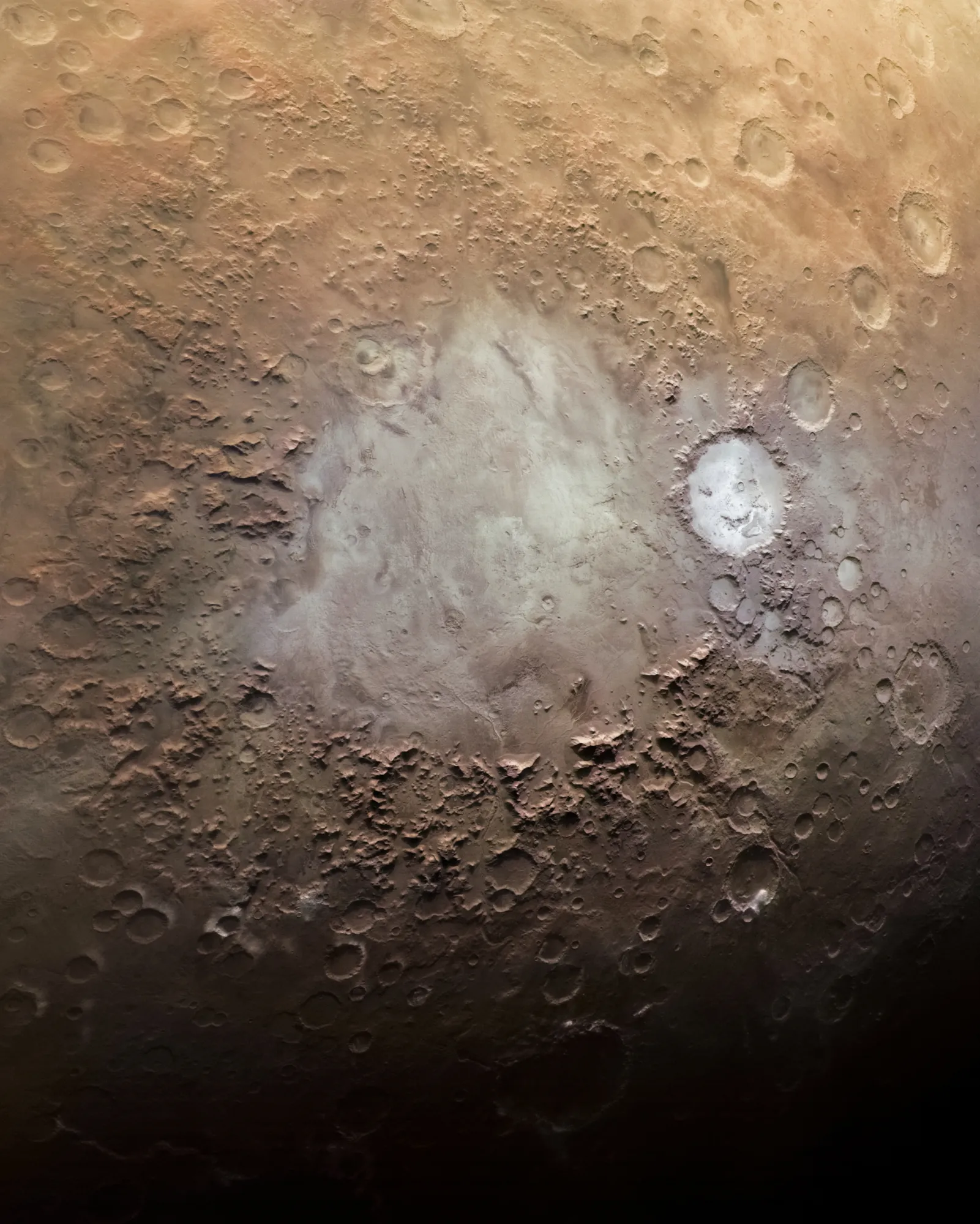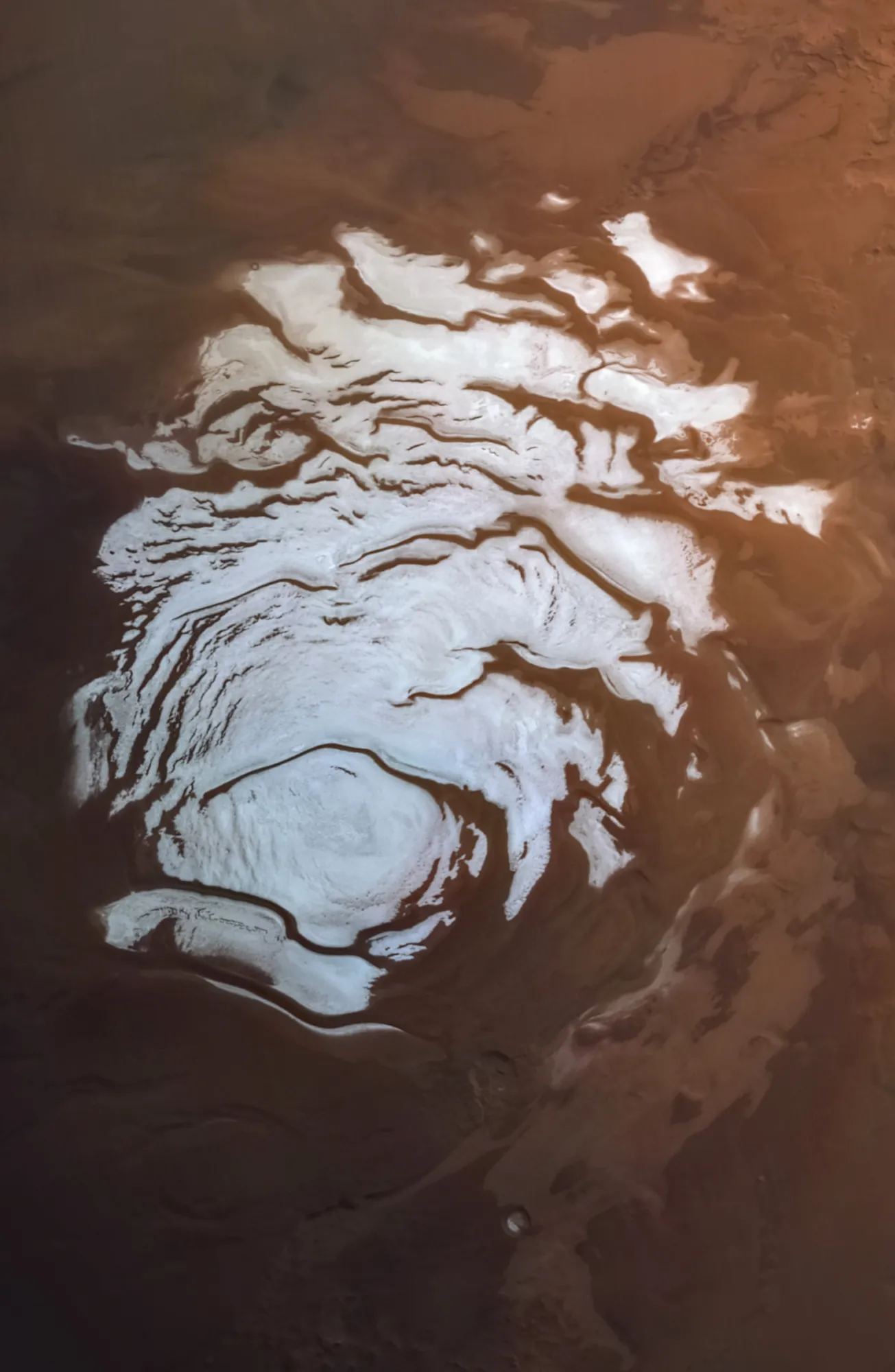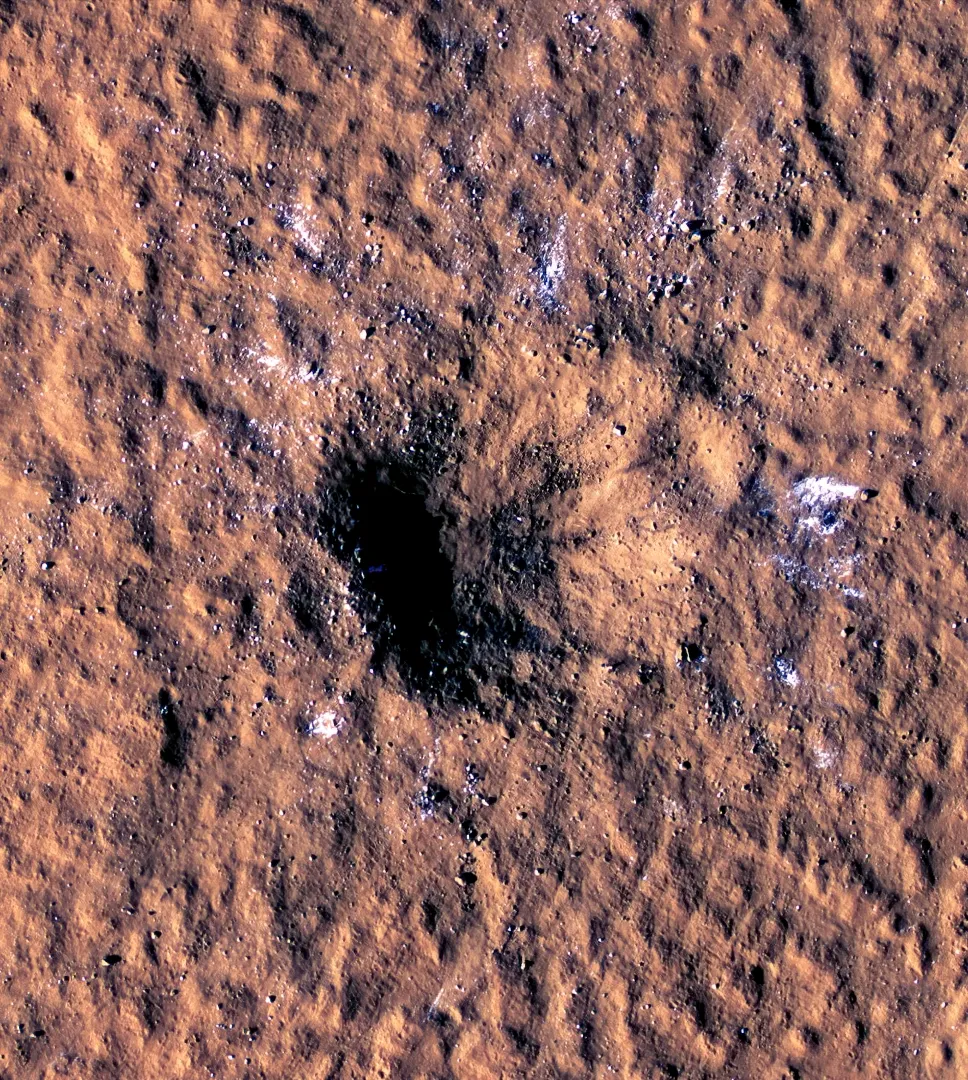 Дело в том, что 24 декабря 2021 года аппарат InSight зафиксировал подземный толчок мощностью 4 балла (для Марса это много). Оказалось, марсотрясение вызвал удар метеорита, оставившего именно этот кратер. Белое вещество возле воронки — это водяной лёд, выброшенный из подповерхностных слоёв грунта.