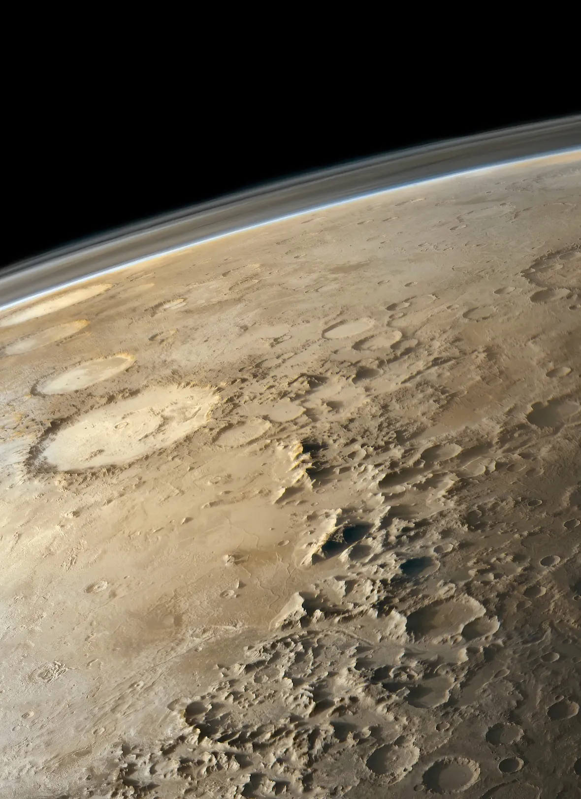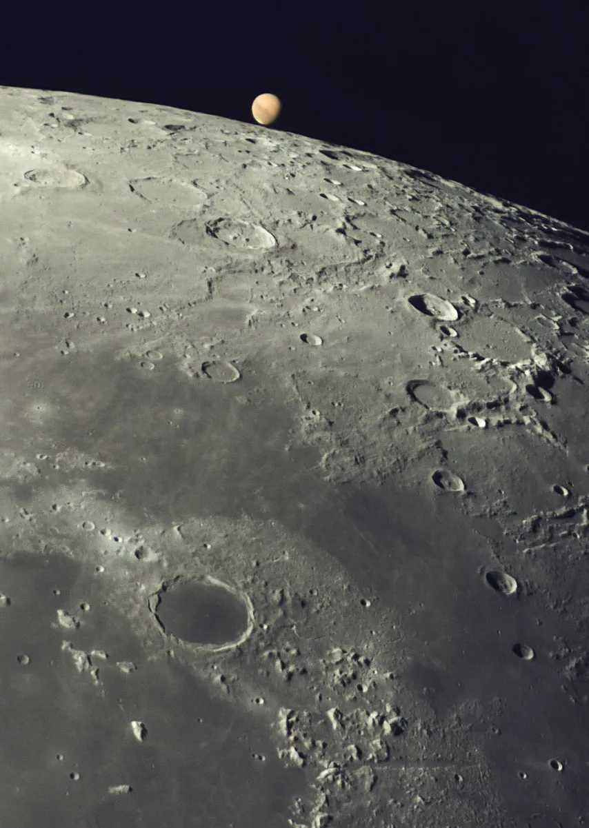 Луна при движении по небу перекрывает расположенную в нескольких сотнях миллионов километров планету Марс. Пойман момент, когда два небесных тела соприкасаются друг с другом.