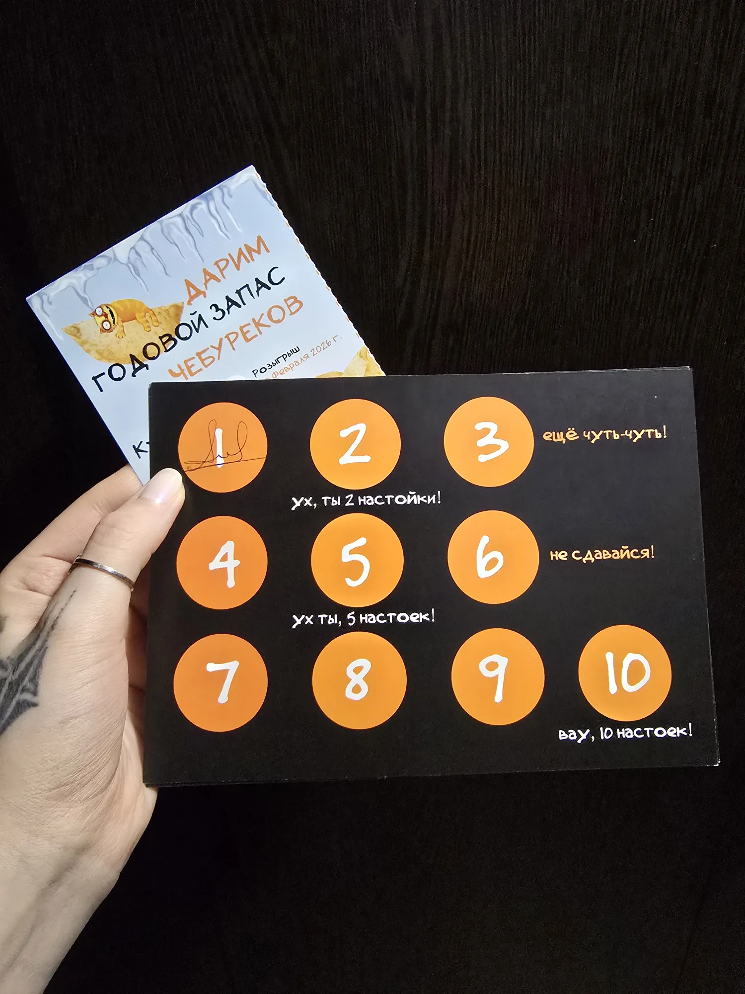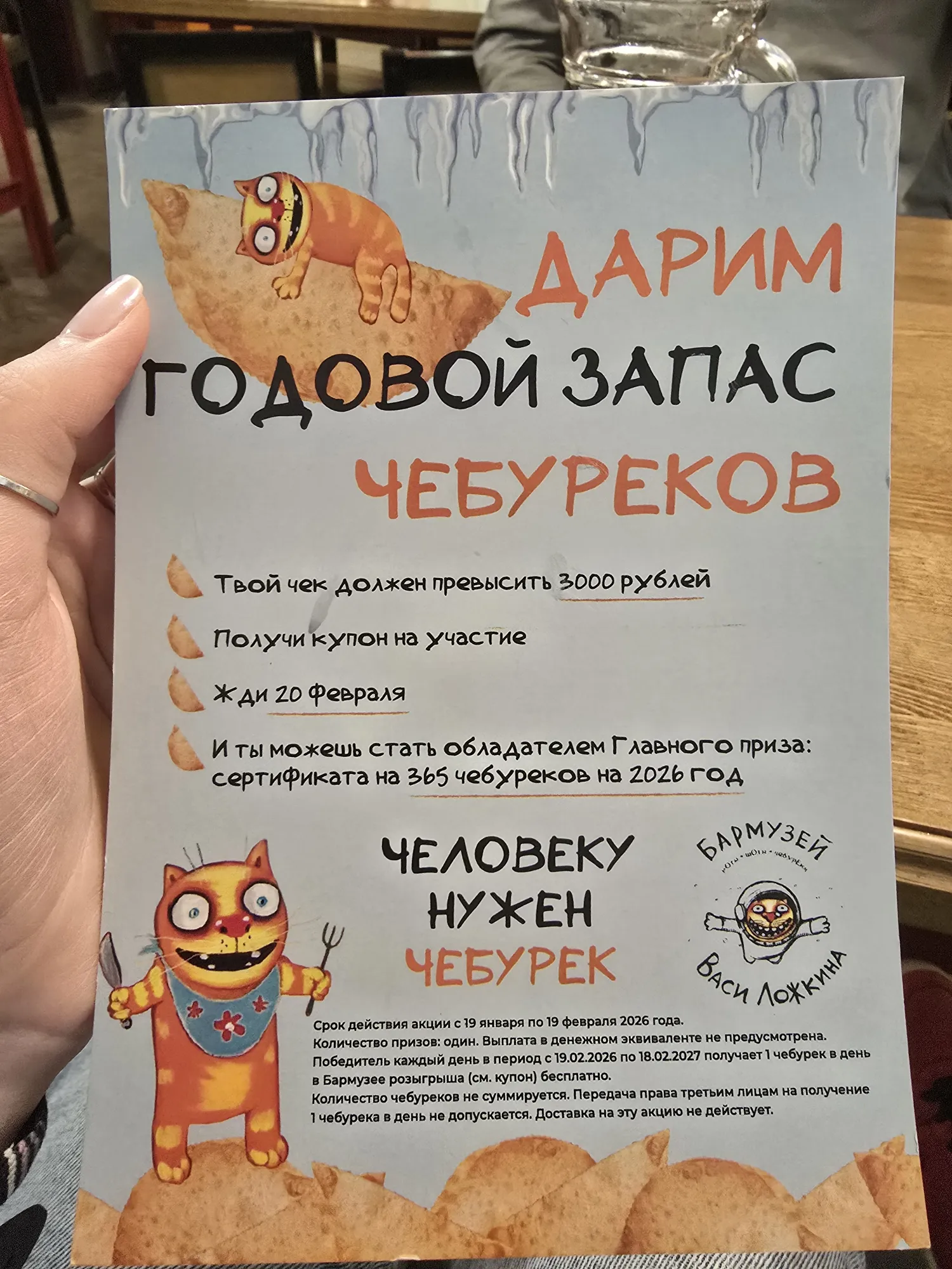 А в финале каждому из нас дали по купончику в текущем розыгрыше (на годовой запас чебуреков) и ещё по карточке, в которой будет отмечаться каждое наше посещение и за него будет даваться определённое количество настоек. Отсчёт пойдёт со второго посещения, там должны халявно налить 2 и так далее)