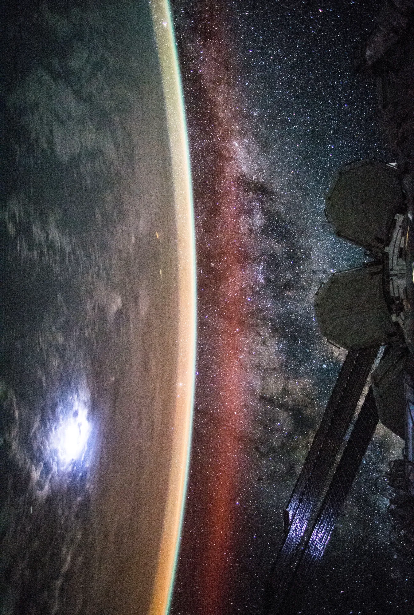 На изображении можно заметить удар молнии на Земле, он получился настолько яркий, что он осветил солнечные панели космической станции.