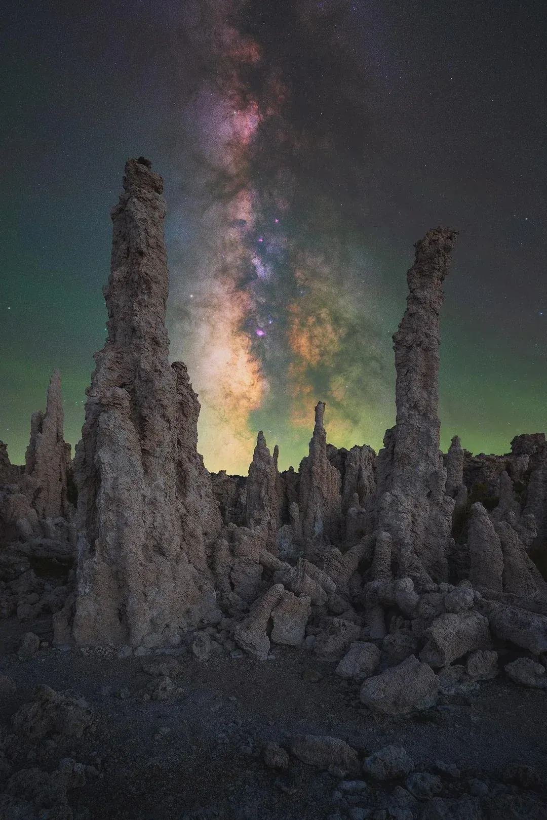 Недалеко от озера Моно в Калифорнии стоят необычные кремового цвета скальные образования - туфы. Они возникли там, где подводные источники, богатые кальцием, встречались с водой озера, насыщенной карбонатами. В результате образовался известняк, который постепенно накапливался, создавая высокие башни. Когда уровень озера со временем понизился, эти каменные столбы оказались на суше.
