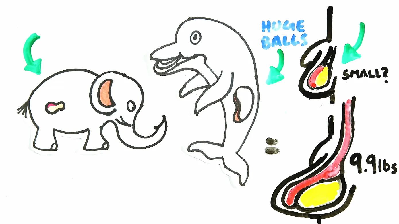 И по сравнению с дельфинами, чьи яички огромны и составляют около 4% массы тела (эквивалент человеческих яичек весом примерно 4,5 кг), можно подумать, что наши в целом маленькие.