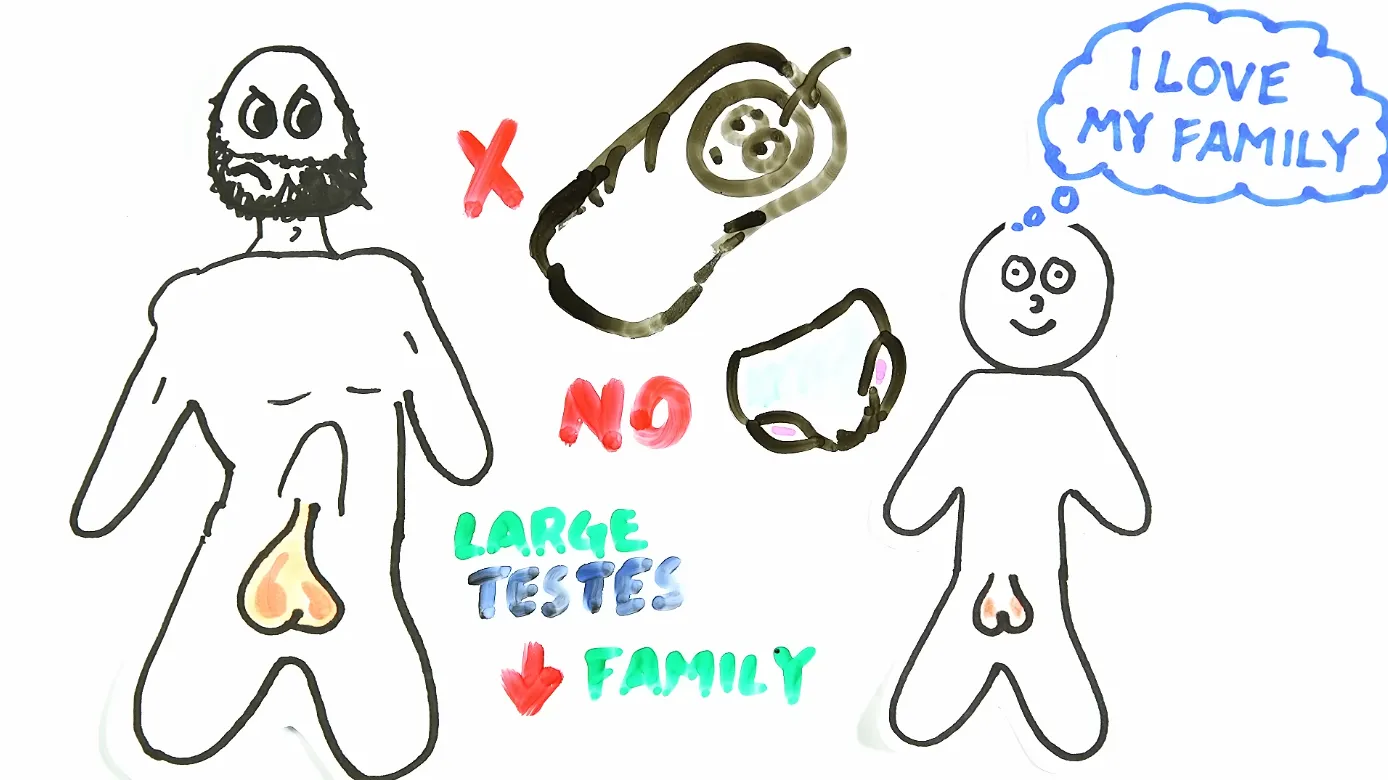 Это перекликается с другими исследованиями приматов. У горилл и колобусов яички меньше, потому что они более склонны к моногамии. Тогда как обезьяны, спаривающиеся с множеством партнёров, вроде макак, имеют более крупные яички из-за конкуренции спермы. Возможно, мужчины с большими яйцами — плохие отцы, потому что менее склонны к моногамии и поэтому менее заботливы к своим семьям. Это экстраполяция, но, может быть, если ты ищешь преданного партнёра, а у него большие обвислые яйца — пора бежать. Опять же, достоверных исследований на эту тему нет.