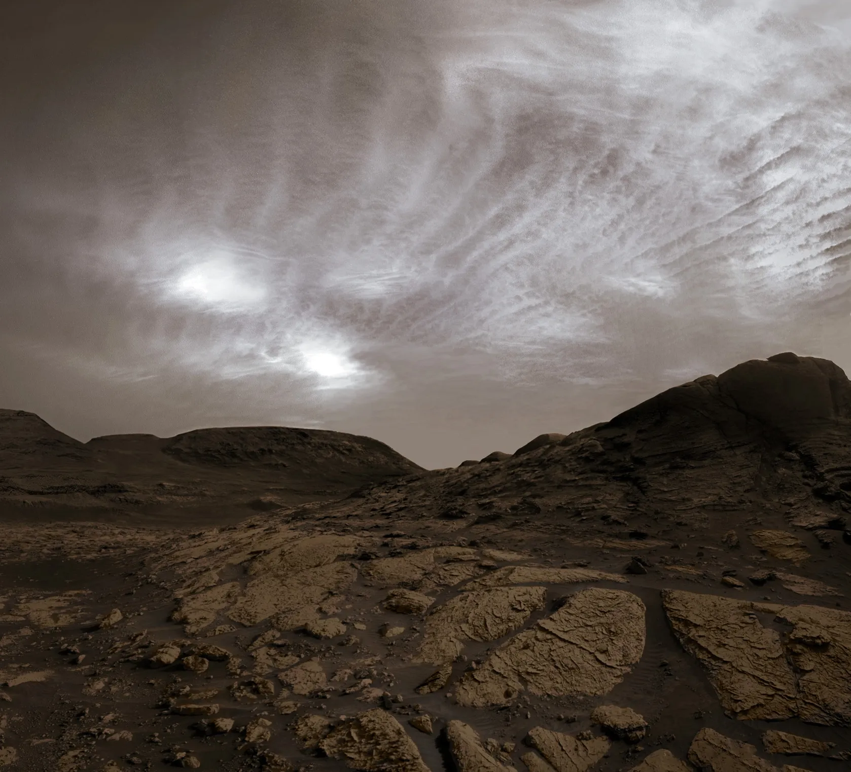Красивое пасмурное небо над кратером Гейла на Марсе