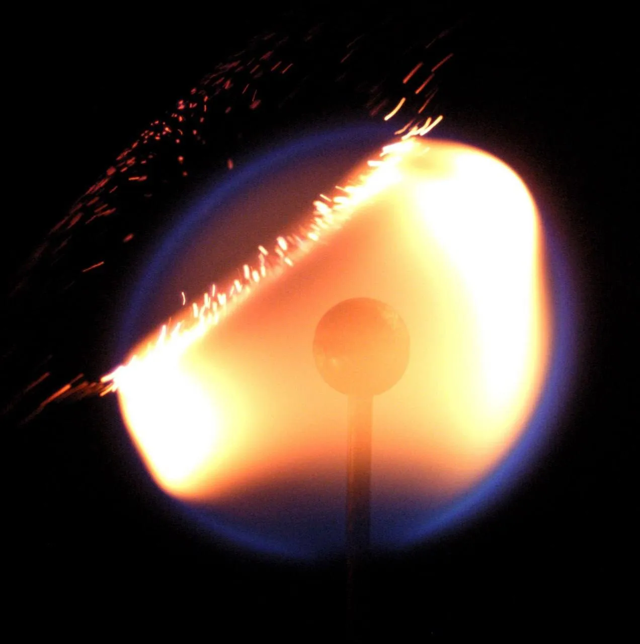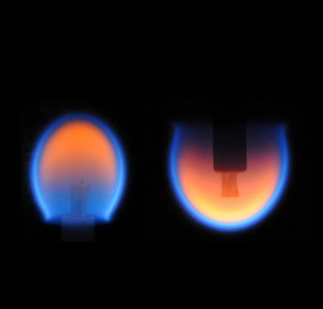 Микрогравитация существенно влияет на характер горения. На Земле горячие газы от пламени поднимаются вверх, а гравитация притягивает более холодный и плотный воздух к основанию пламени, создавая характерную вытянутую форму и эффект мерцания. В микрогравитации этот конвективный поток не возникает, что упрощает процесс горения и приводит к образованию сферического пламени. Оно горит медленнее, при более низкой температуре (менее 480°C) и требует меньше кислорода. Сферичность объясняется тем, что пламя питается процессом молекулярной диффузии: горение происходит на границе между топливом и воздухом, и вся поверхность пламени становится зоной реакции. Цвет тоже меняется — без гравитации углеродные цепочки не сгорают полностью, и пламя становится голубым и тусклым.