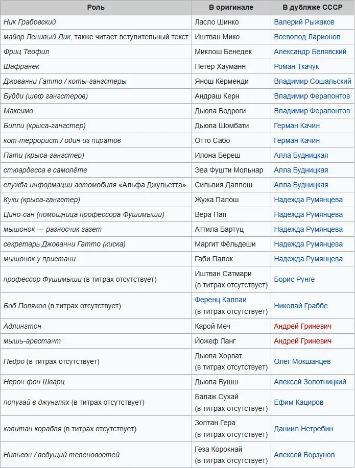 Полный список актёров, озвучивавших роли, я вам приведу из Википедии. Судя по всему, бюджета на озвучку было не так много, поэтому один актёр озвучивал несколько ролей. Ну или просто решили, что не стоит тратиться на актёра на мелкую роль. В оригинале это всё были актёры, весьма известные в Венгрии, и совершенно неизвестные в остальных странах.