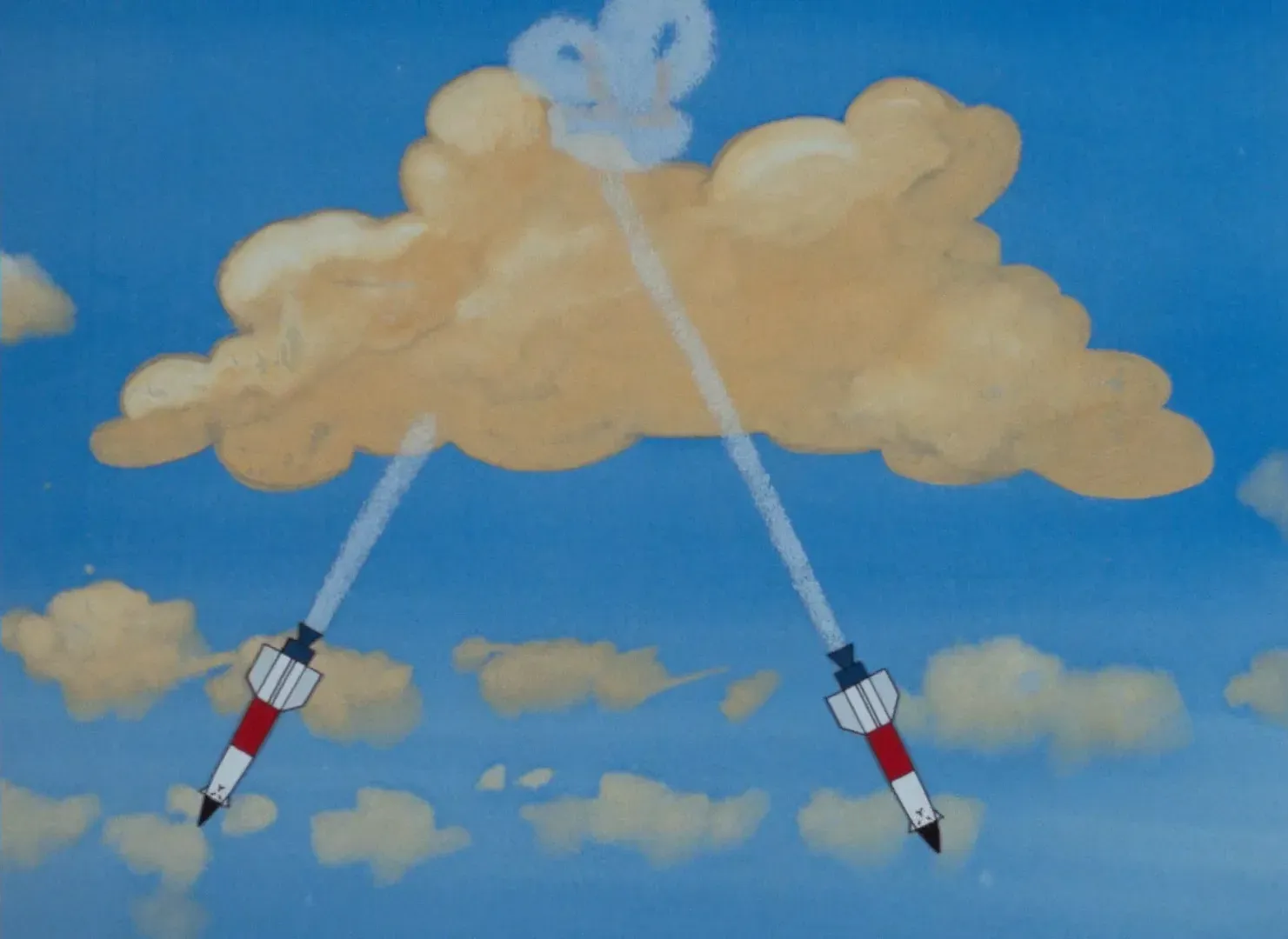 Хотя, конечно, ничто не сравнится с ракетами, которые запутались в своих же следах. Потом это облако начинает дождить прямо над Грабовским, который спрыгнул с самолёта, и Грабовский раскрывает парашют только затем, чтобы его подружка не промокла.