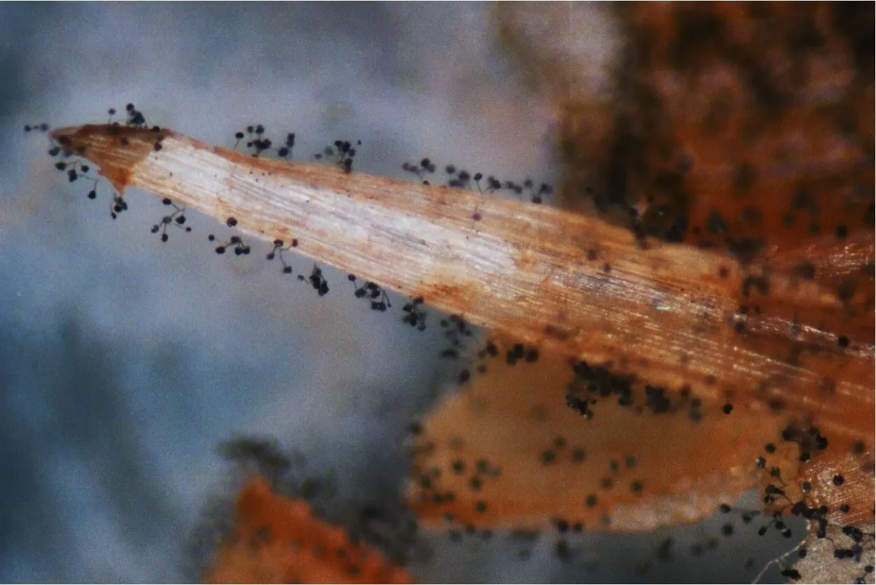 Гифы и конидиеносцы (выросты мицелия, на которых развиваются споры) изначально прозрачные, со временем становятся тёмно-пигментированными. Конидиеносцы могут быть простыми или разветвлёнными, на их вершинах - фиалиды (конечные одноклеточные спороносящие структуры на верхушке конидиеносца). Фиалиды пигментированные, цилиндрические, с вздутыми верхними частями, образуют скопления по 3-10. Конидии, они же споры (4,5×9 мкм), овальные, собраны в скопления. Споры у Stachybotrys chartarum обычно имеют веретеновидную или эллиптическую форму и часто собраны в гроздья, напоминающие кисти винограда.
