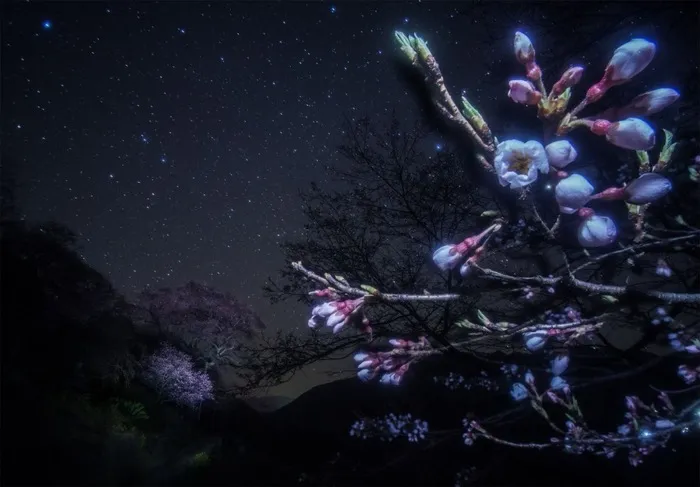 На снимке — цветение сакуры под звездным небом Японии, запечатленное в 2015 году. История дерева, часть которого видна на переднем плане, отличается от обычного жизненного цикла его "сородичей".