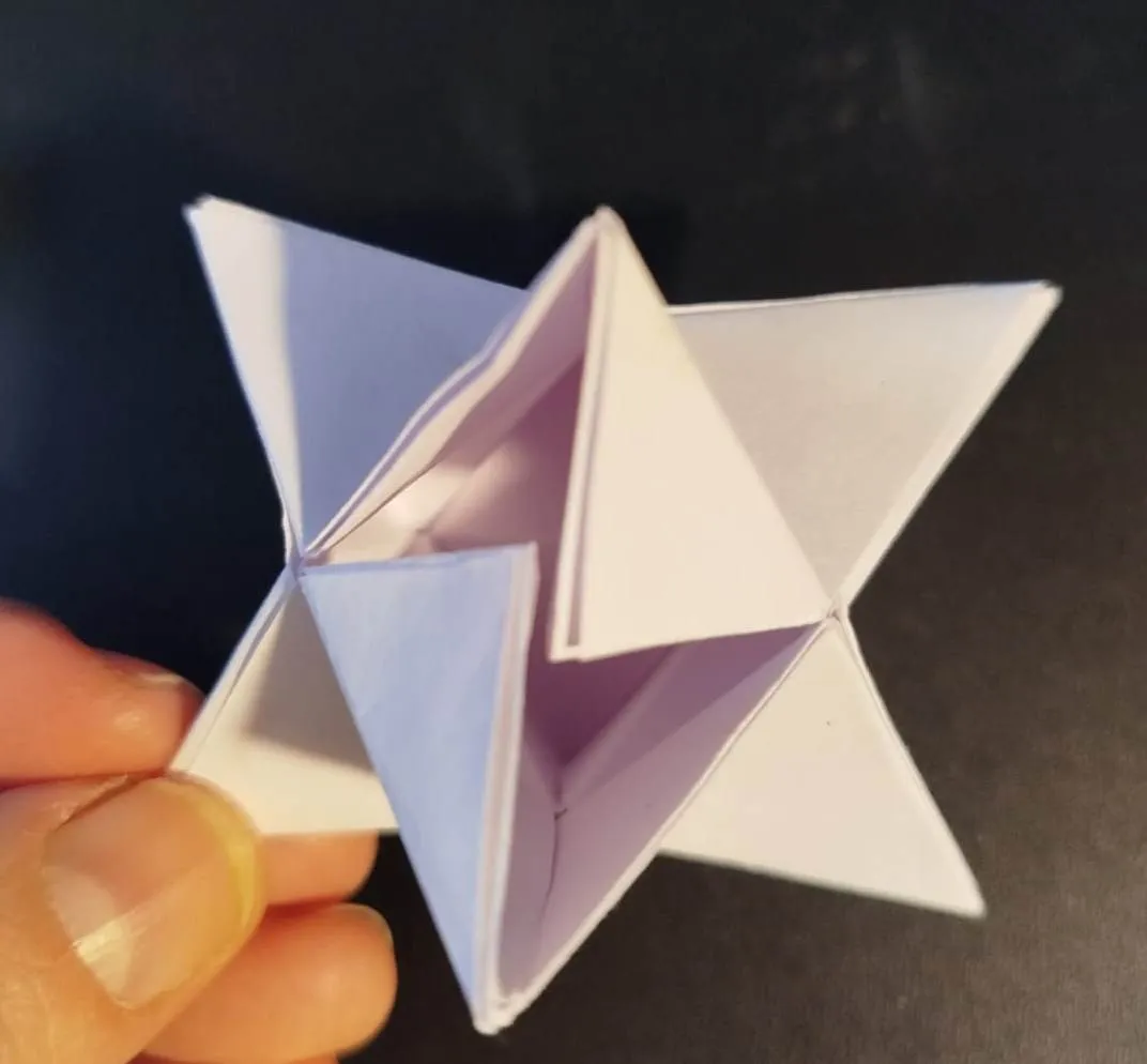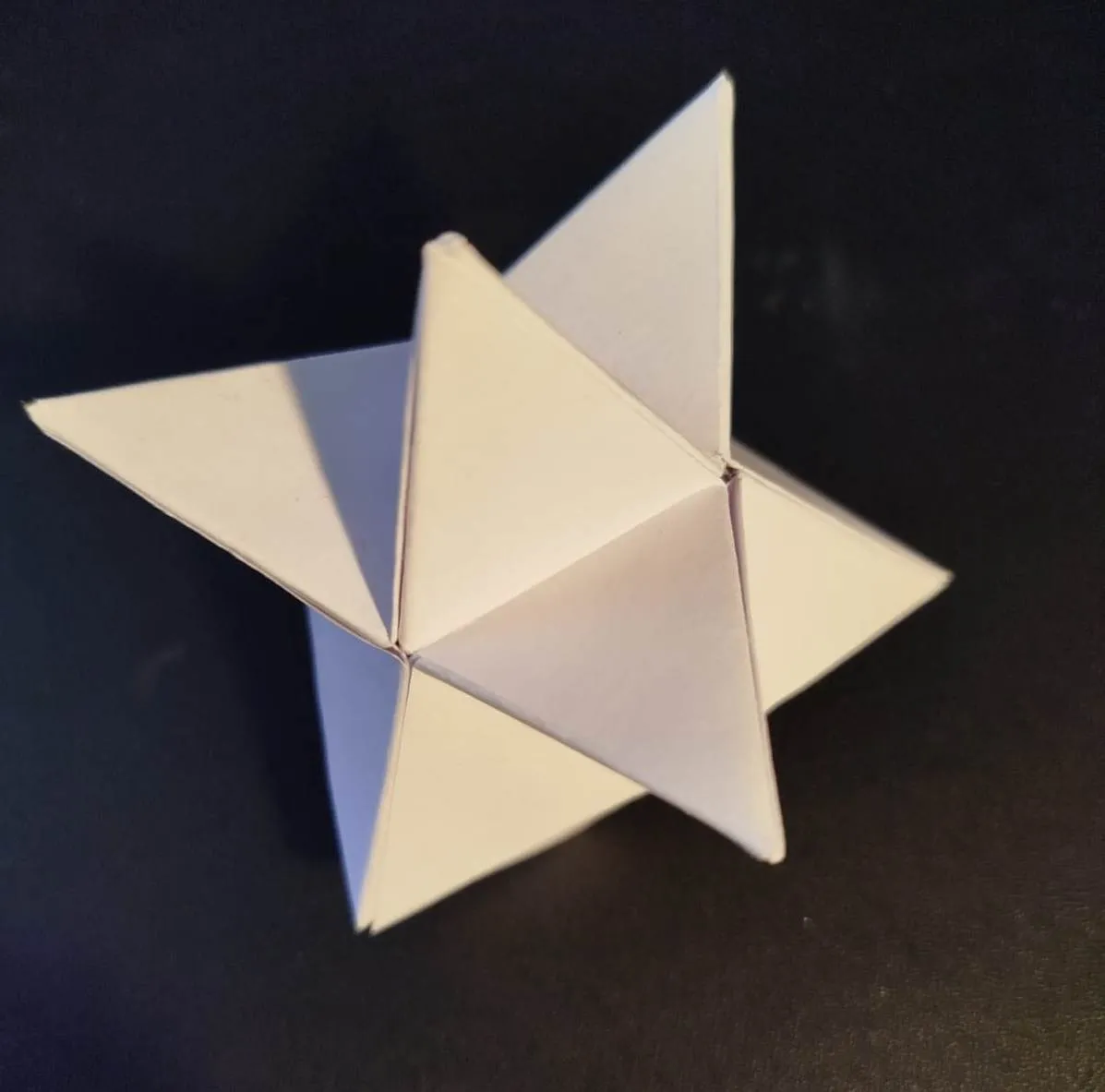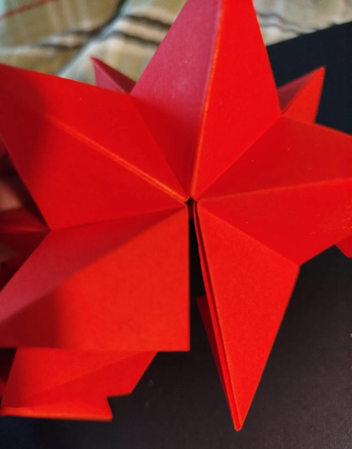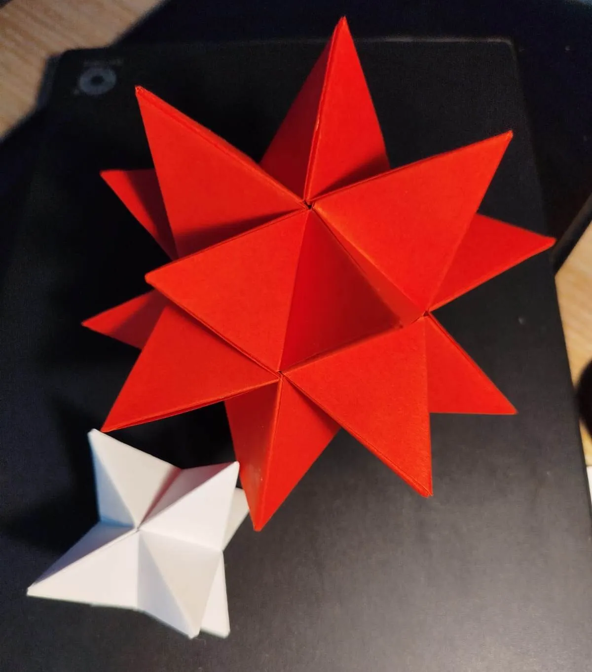 Первое - берем лист А4 и складываем его несколько раз, чтоб получилось 16 прямоугольников. Разрезаем. На одну звезду, кристалл или как угодно называйте (она представляет собой 2 соединенных тетраэдра), у которой 8 вершин, надо 12 листочков. Не 9, как написано в инструкции, а 12.